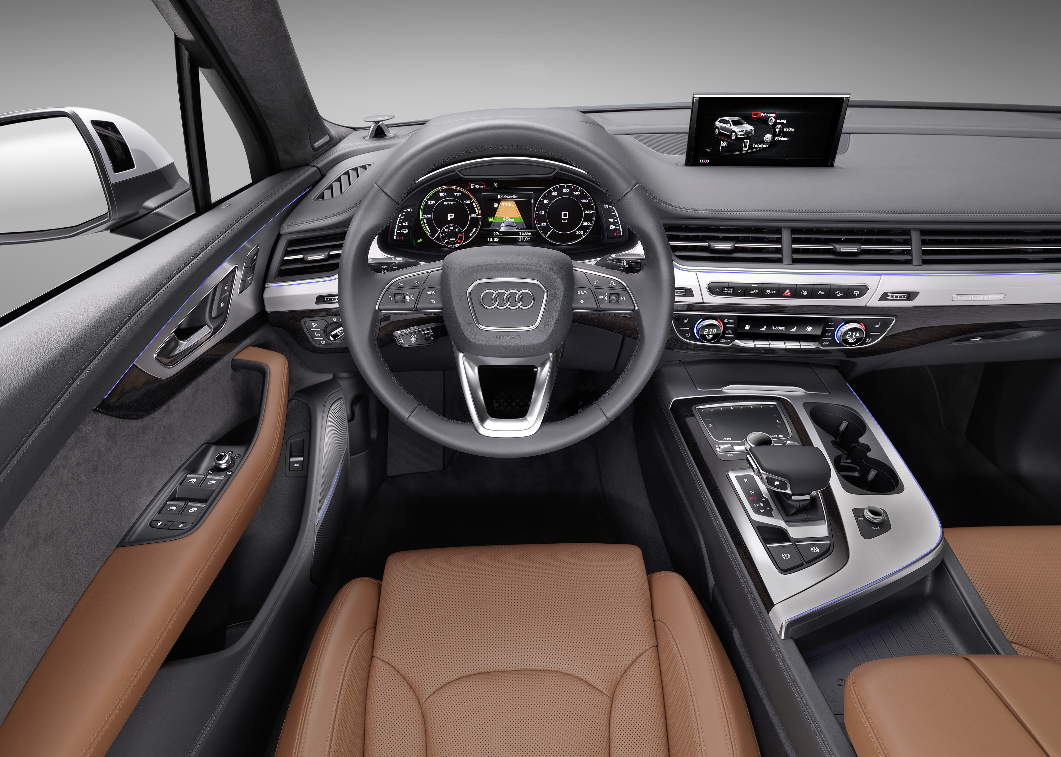 В стандартное оснащение Audi Q7 e-tron входит виртуальная информационная система водителя – полностью цифровая приборная панель с 12,3-дюймовым экраном, воспроизводящим информацию с высокой степенью разрешения. Водитель получает различного рода информацию, в том числе показания мощности, расхода электроэнергии, запас хода на электричестве и на топливе, а также уровень заряда батареи.