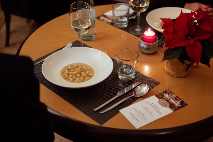 В ресторане “Sale & Pepe” гостей удивило предложенное хозяином рождественское меню, особенно традиционное болонское блюдо – паста с начинкой, которую подают в говяжьем и курином бульоне. В течение вечера во время мастер-класса каждый мог попробовать ее приготовить, используя только местные итальянские продукты. Рафаэль встречал гостей классическим итальянским напитком Spritz, дополнив его итальянской закуской Flan al parmigiano con aceto balsamico – пирогом с пармезаном и бальзамическим уксусом. Затем отведали приготовленные самими же тортеллини, а в качестве основного блюда к столу подали традиционное кушанье региона Пьемонт vitello tonnato – телятину, которая подается с тунцовым соусом. На сладкое гостям подали semifreddo – классический итальянский десерт.
