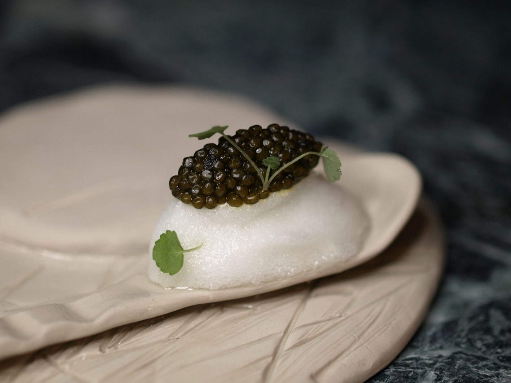 Холодный бульон из морепродуктов, снежный краб и золотая икра осетра