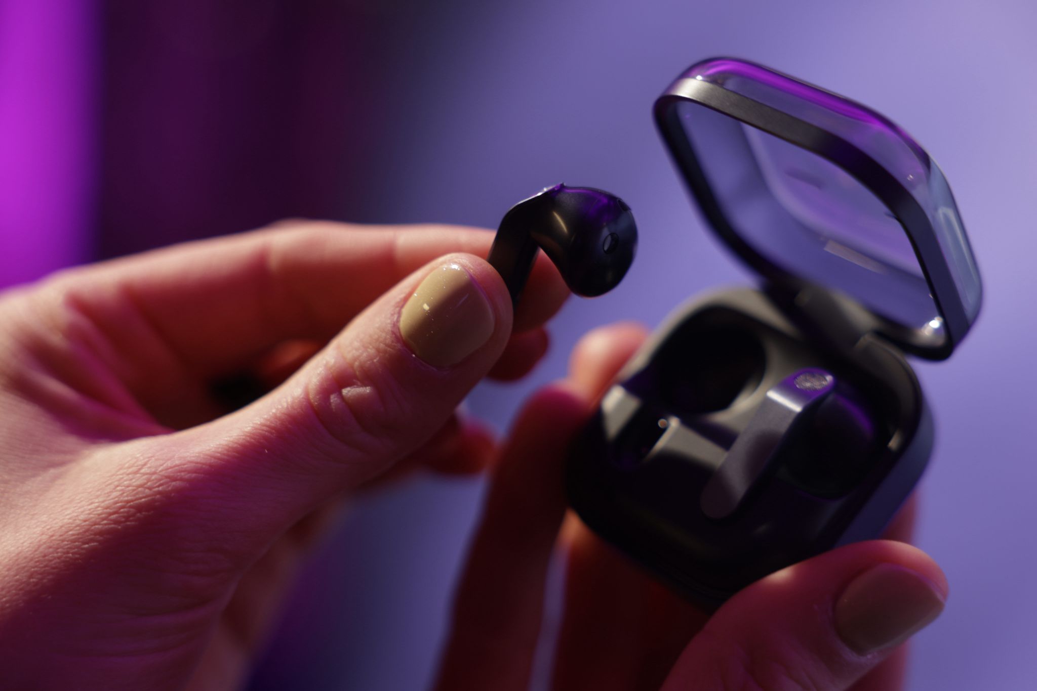 Новые ножки наушников оснащены удобным углублением сбоку – тактильной панелью управления, которая позволяет простыми касаниями управлять воспроизведением контента и быстро получать доступ к различным настройкам. Прозрачный футляр в формате «ракушки» сочетает стиль и практичность, делая хранение и зарядку интуитивно понятными.