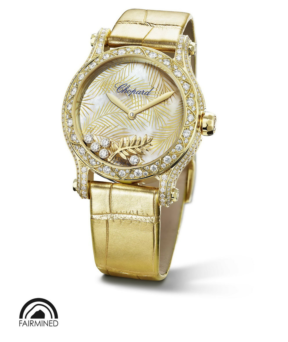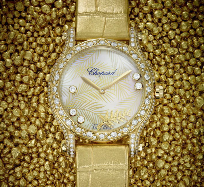 Компания Chopard, официальный партнер Каннского кинофестиваля и бессменный создатель «Золотой пальмовой ветви» с 1998 года, представляет новые часы, навеянные этой престижной наградой. Подлинная квинтэссенция элегантности, часы Happy Palm украшены бриллиантами и так же, как «Золотая пальмовая ветвь», изготовлены из «этичного» золота с сертификатом Fairmined. Новые часы воплощают собой обворожительную магию знаменитого фестиваля. На искусно отделанном перламутровом циферблате пляшут пять подвижных бриллиантов и миниатюрная золотая пальмовая ветвь с идеально воспроизведенными изящными листьями. Для ее отделки применен лак, получаемый из смолы растущего в Азии дерева уруши, и старинная японская техника «маки-э» (в буквальном переводе «усеянное изображение»). Работая с исключительной точностью, мастер выполнил и оттенил узоры на циферблате, нанеся мельчайшие крупинки золота на еще не засохший лак. Для создания этого великолепного растительного узора понадобилось 170 часов работы.