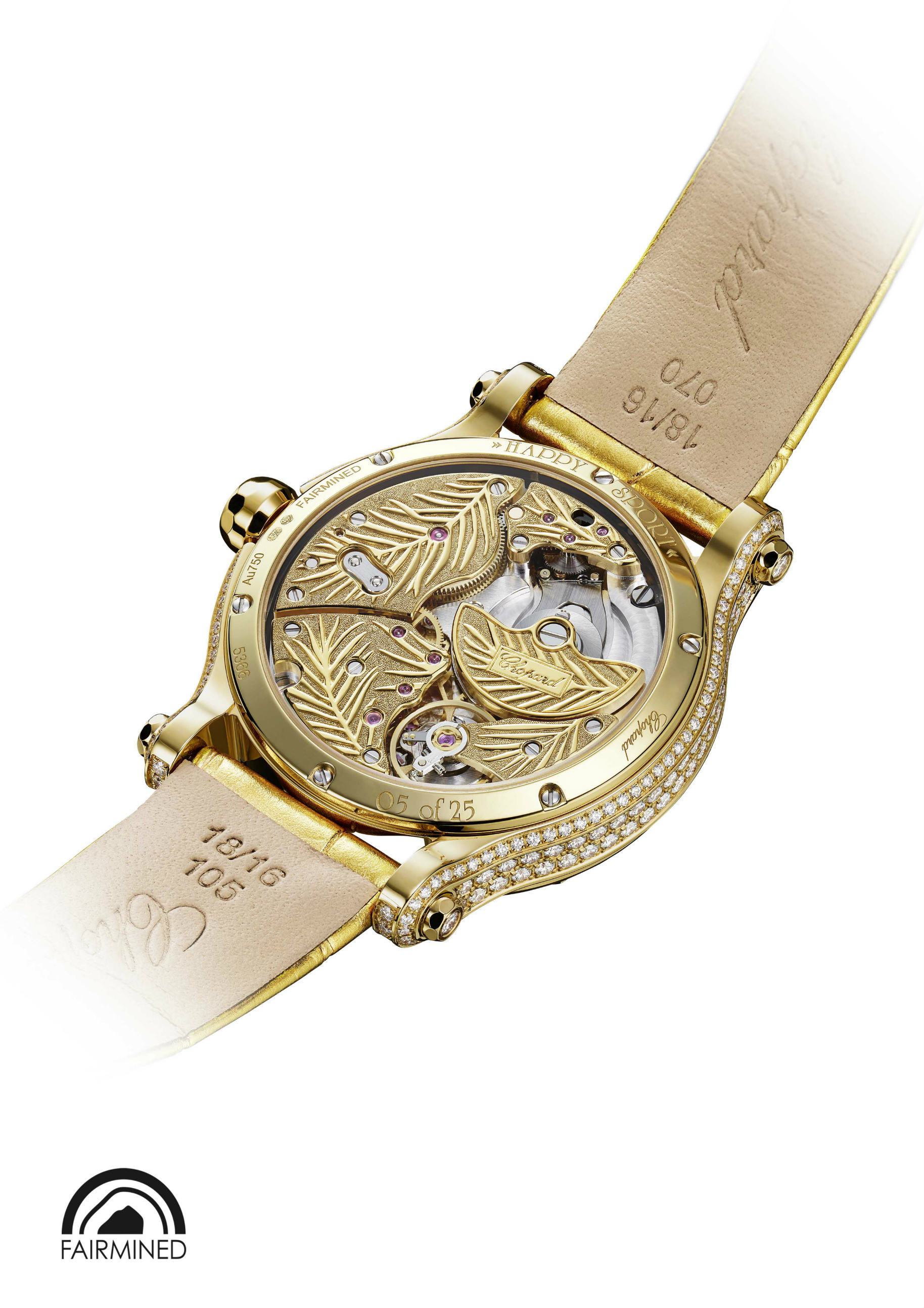 Обратная сторона корпуса представляет собой не менее эффектное произведение искусства. Калибр L.U.C 96.23-L украшен тончайшими пальмовыми ветвями, выгравированными вручную в технике fleurisanne. Особенность этого метода заключается в рельефности изображения: гравировщик не вырезает рисунок, а формирует его, убирая лишний материал вокруг. Часы Happy Palm выпущены лимитированной серией из 25 экземпляров.