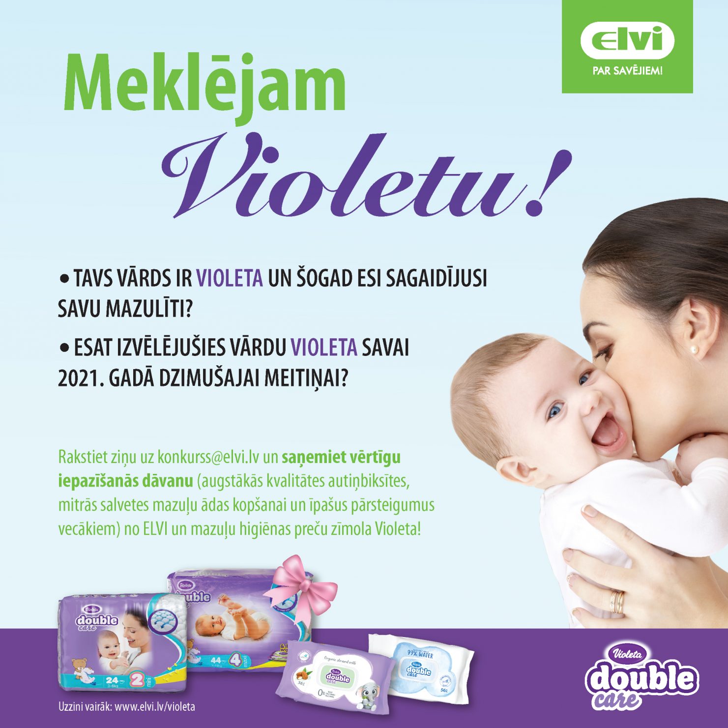 Чтобы отпраздновать появление бренда «Violeta» на рынке Латвии и порадовать молодые семьи, в течение всего этого года ELVI предлагает молодым мамочкам Виолетам, а также семьям, в которых малышек в этом году назовут чудесным именем Виолета, получить ценные подарки на радость малышам и молодым родителям.