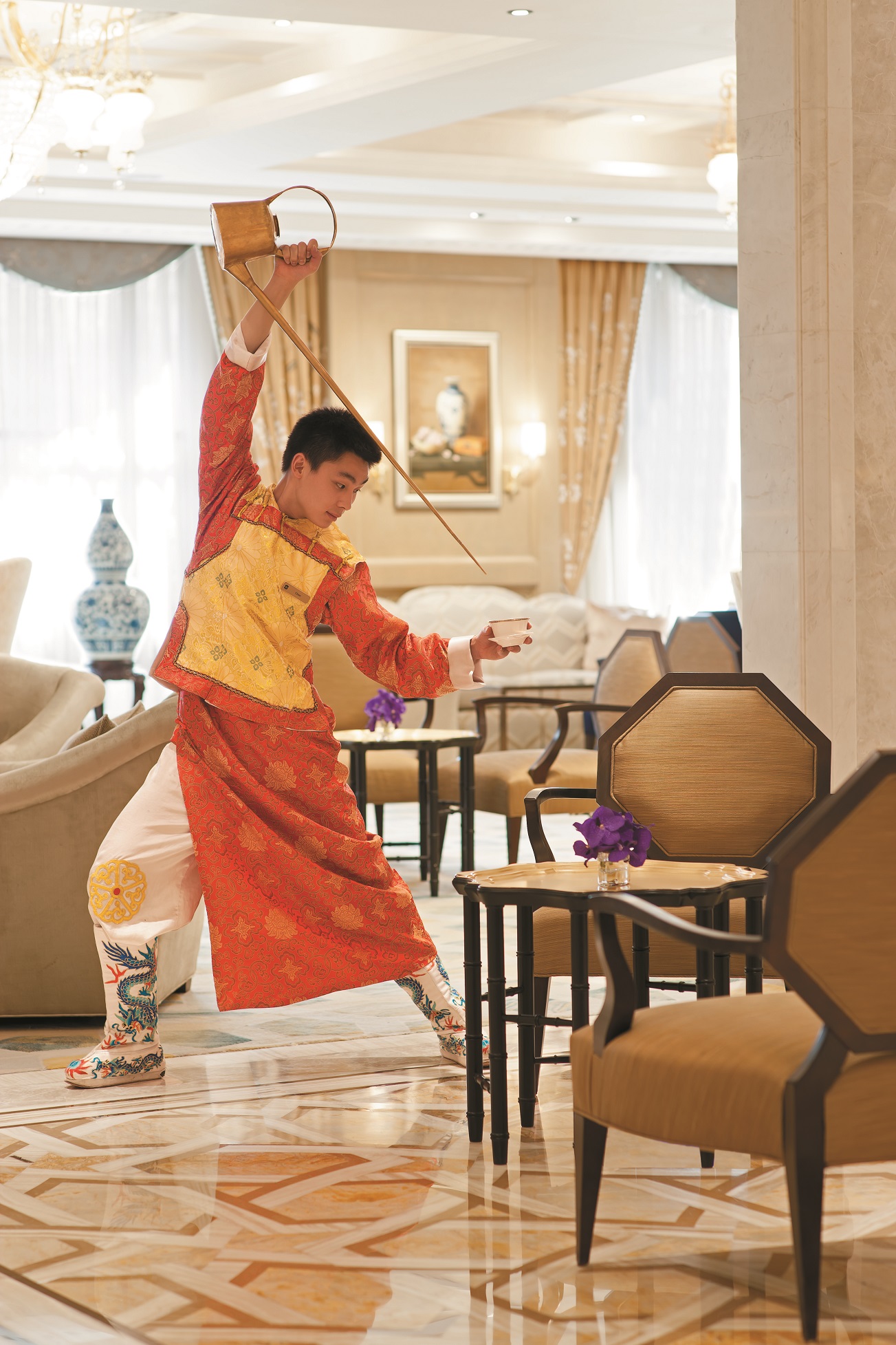 Вместе с открытием Shang Palace в отель вернуться неожиданные представления. Единственный в Стамбуле «Чайный мастер Кунг-фу» будет удивлять гостей чайной церемонией с элементами боевых искусств. Эта необычная чайная церемония, вдохновленная искусством Кунг-фу и являющаяся одним из уникальных примеров китайского фольклора, станет настоящим сюрпризом для посетителей Shang Palace. Чайный мастер Кунг-фу филигранно жонглирует миниатюрным чайником с очень длинным носиком. Мастер оттачивает это искусство годами, ведь сам термин «Кунг-фу» означает умение, мастерство, опыт, и применяется не только к боевым искусствам, но и по отношению к мастерству музыканта или повара.