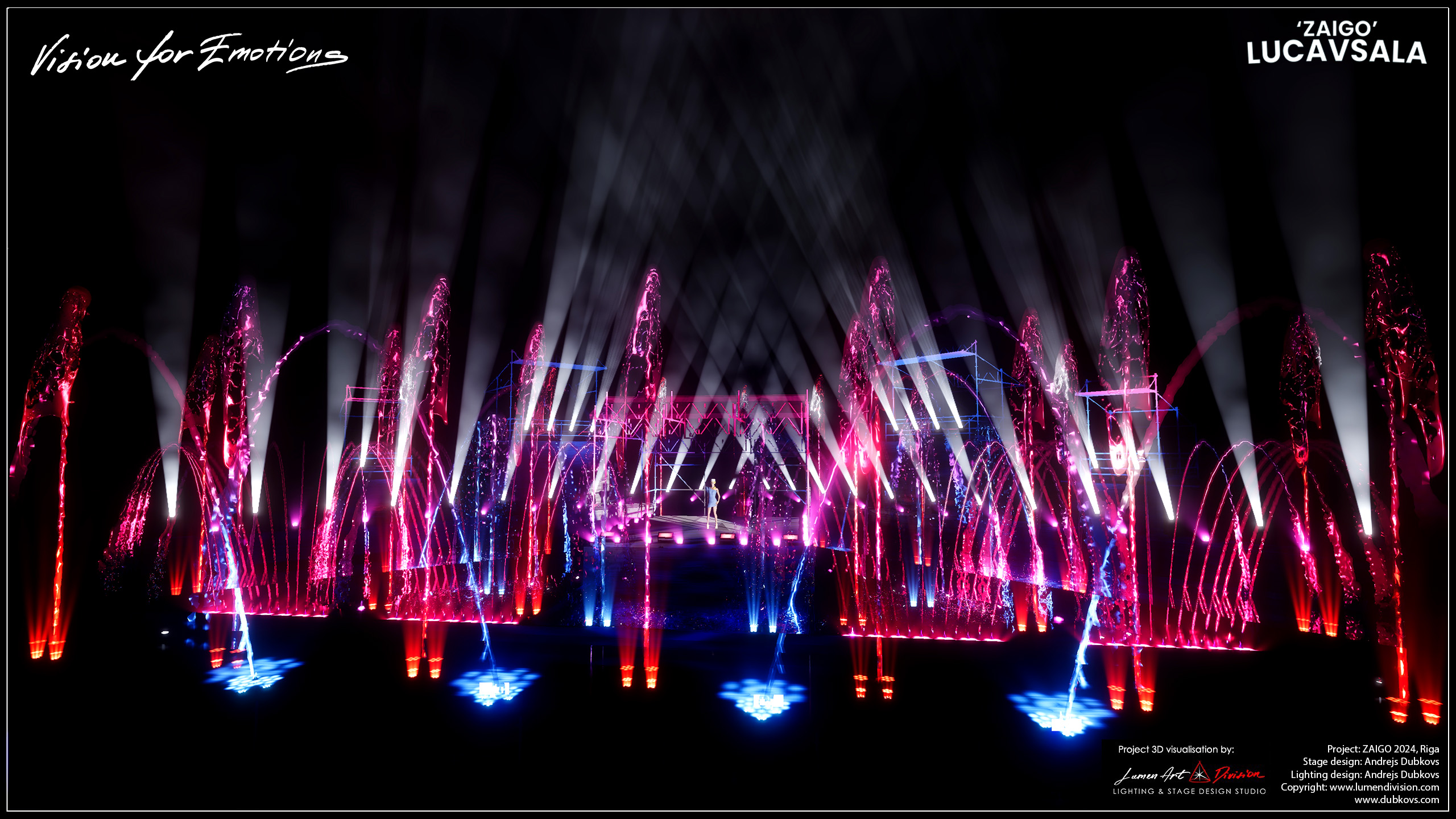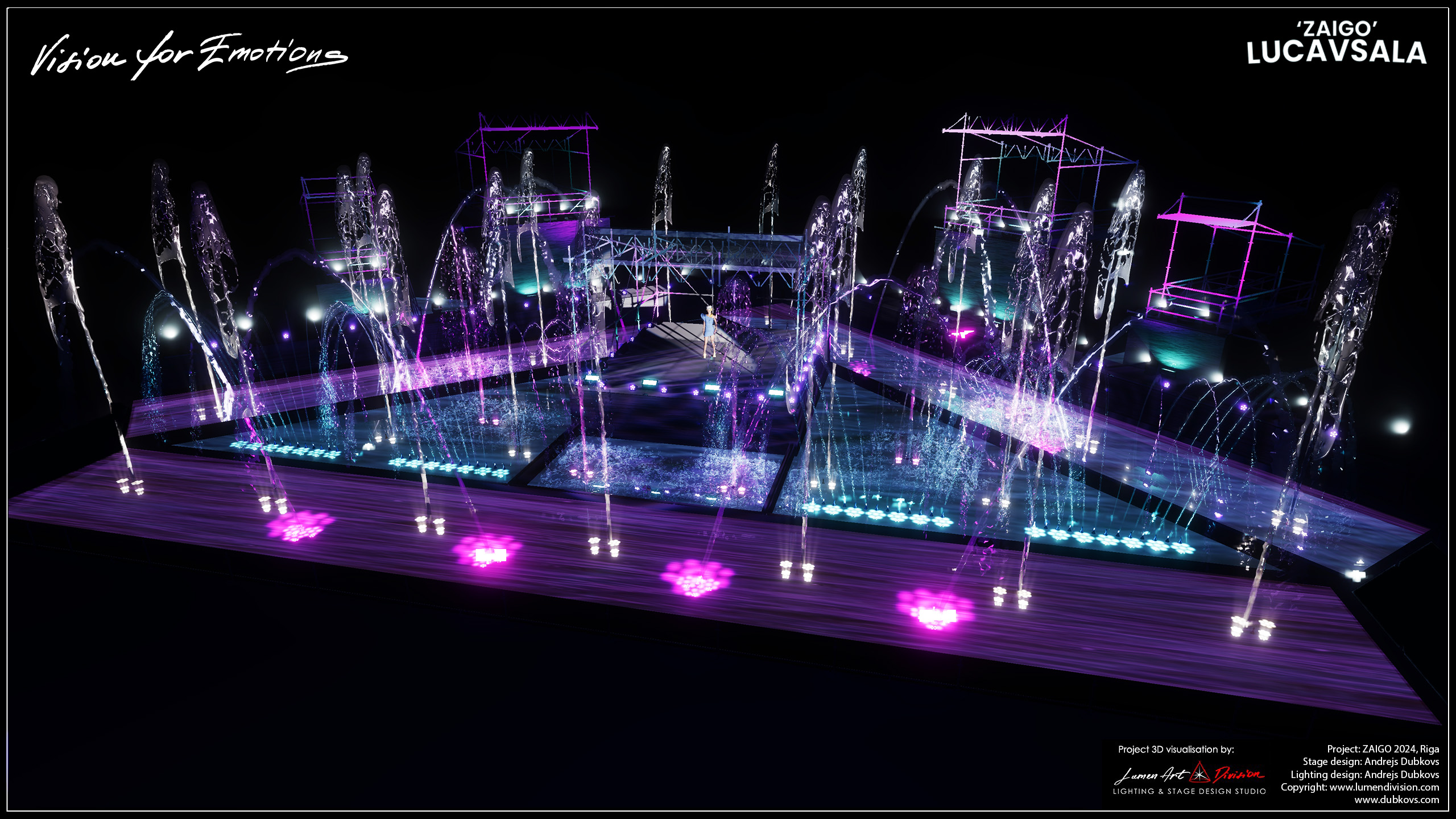 «Zaigo» — самое масштабное в этом году передвижное шоу фонтанов в Балтии, в котором задействовано более 100 мультимедийных сценических спецэффектов, включая танцующие фонтаны, водные гейзеры высотой до 30 метров (используя 100 тонн воды), огнеметы, лазерное и световое шоу, а также инструментальное сопровождение (виолончель, барабаны) и ряд известных музыкальных произведений в исполнении певицы Динары Рудане.