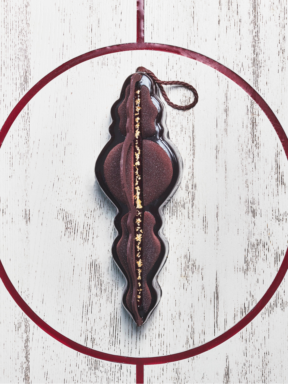 Хрустящая миндальная основа с добавлением какао-бобов и начинкой из мягкого шоколадного печенья, компота из кислой малины и жареного красного перца, шоколадного заварного крема и кубинского мусса из горького шоколада 75%. — €95