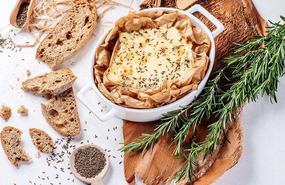 Темная чиабатта (150 г), Янов сыр — Talsu ķimeņu ritulis (350 г), сливочное масло (15 г), тмин (3 г), тимьян (4 г).