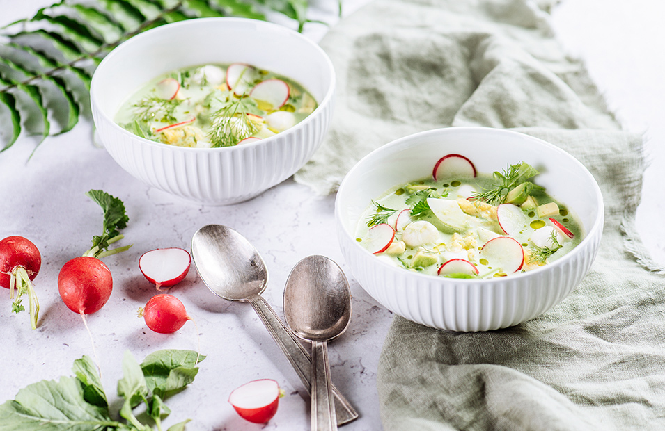 Йогурт без добавок (200 г), кефир (300 г), базилик (40 г), петрушка (30 г), стебли сельдерея для сока (100 г), огурцы для сока (260 г), лимонный сок (15 г), яйца (2 шт.), рукола (20 г), помидоры (80 г), огурцы (60 г), редис (60 г), оливковое масло extra virgin (10 г), зелень для украшения (10 г).