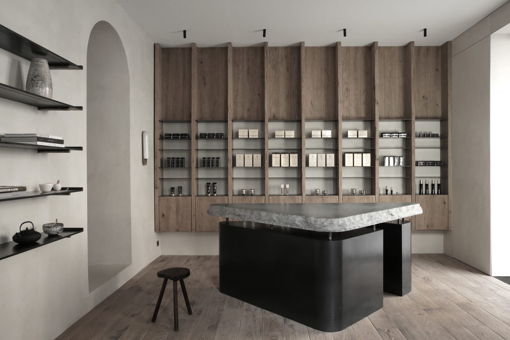Пространство оформлено как частный интерьер, который отлично иллюстрирует двойное франко-японское начало. В элегантном салоне идеально сбалансирован ассортимент самых разнообразных материалов, таких как японская керамика раку, голубой известняк Эно, патинированный металл и матовая латунь. Все текстуры и оттенки применяемых натуральных материалов контрастируют с чистотой архитектурных линий. Подвесной потолок дополнен панелями из рисовой бумаги и украшен барельефом известного скульптора Золтана Зсако. А с обеих его сторон японская керамика и латунь согревают пространство золотом мягкого света и погружают в атмосферу полного расслабления.