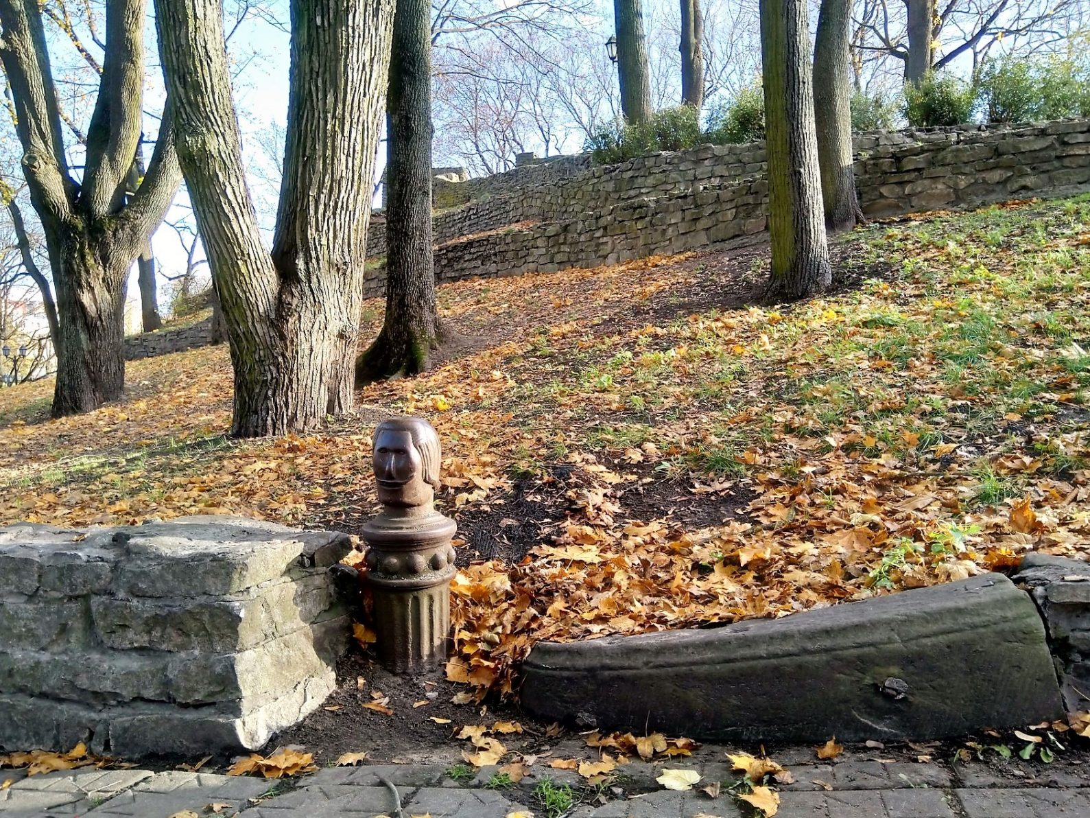 Что может быть для рижанина привычнее, чем Бастионная горка? Есть кто-нибудь, кто хотя бы раз не поднимался на её вершину? И когда поднимаешься, под ноги, ясное дело, не смотришь, смотришь по сторонам, на замечательные виды, открывающиеся то там, то сям. Поэтому то, что оказывается под самым носом, как правило, ускользает от внимания. В том числе и такой милый столбик с усатым мужчиной.