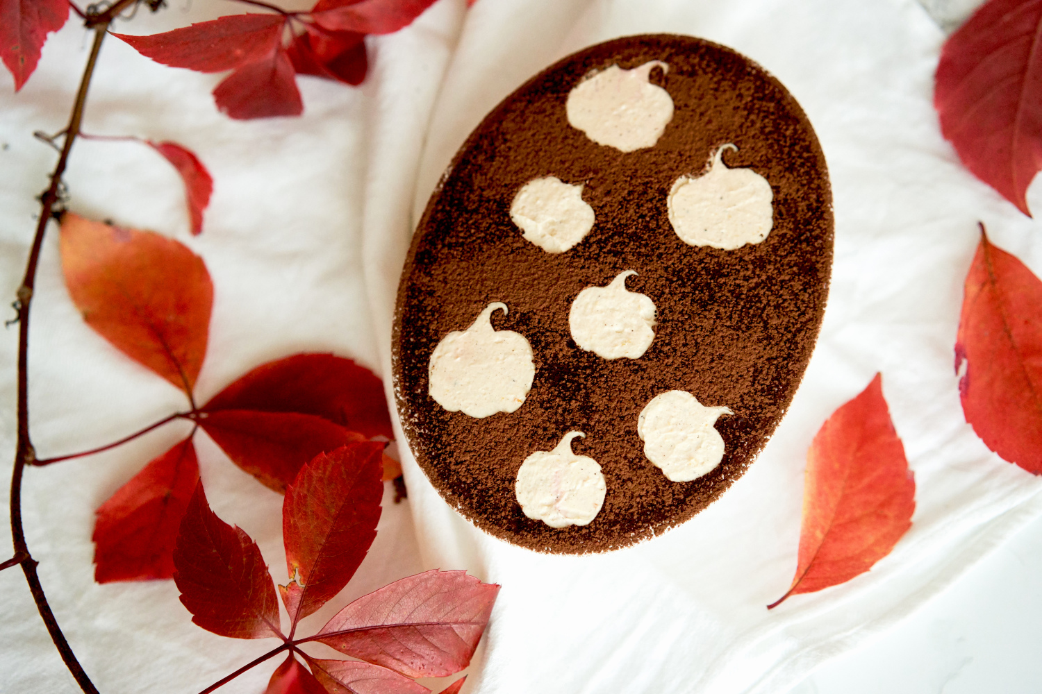 - Украсьте десерт перед подачей — вырежьте бумажные тыквы (или другие тематические фигуры), выложите их поверх десерта, посыпьте десерт какао-порошком, снимите бумажные украшения.