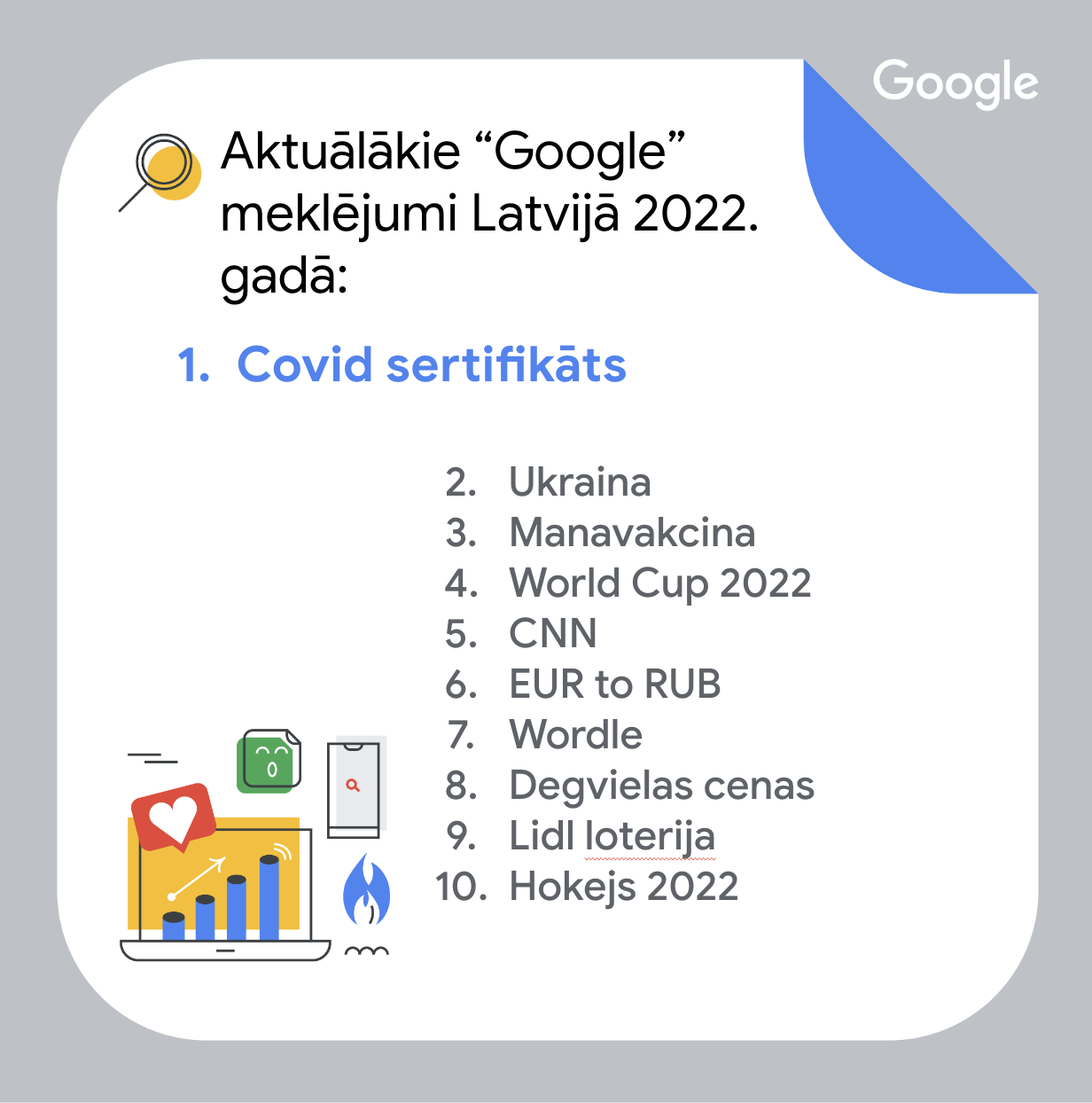 году не потеряла своей актуальности, однако поменялись акценты – в этом году наибольший интерес вызывали сертификаты Covid-19 и возможности вакцинации. Геополитическая ситуация, в свою очередь, резко повысила интерес жителей Латвии к Украине, поставив поиск этой соседней страны на второе место.