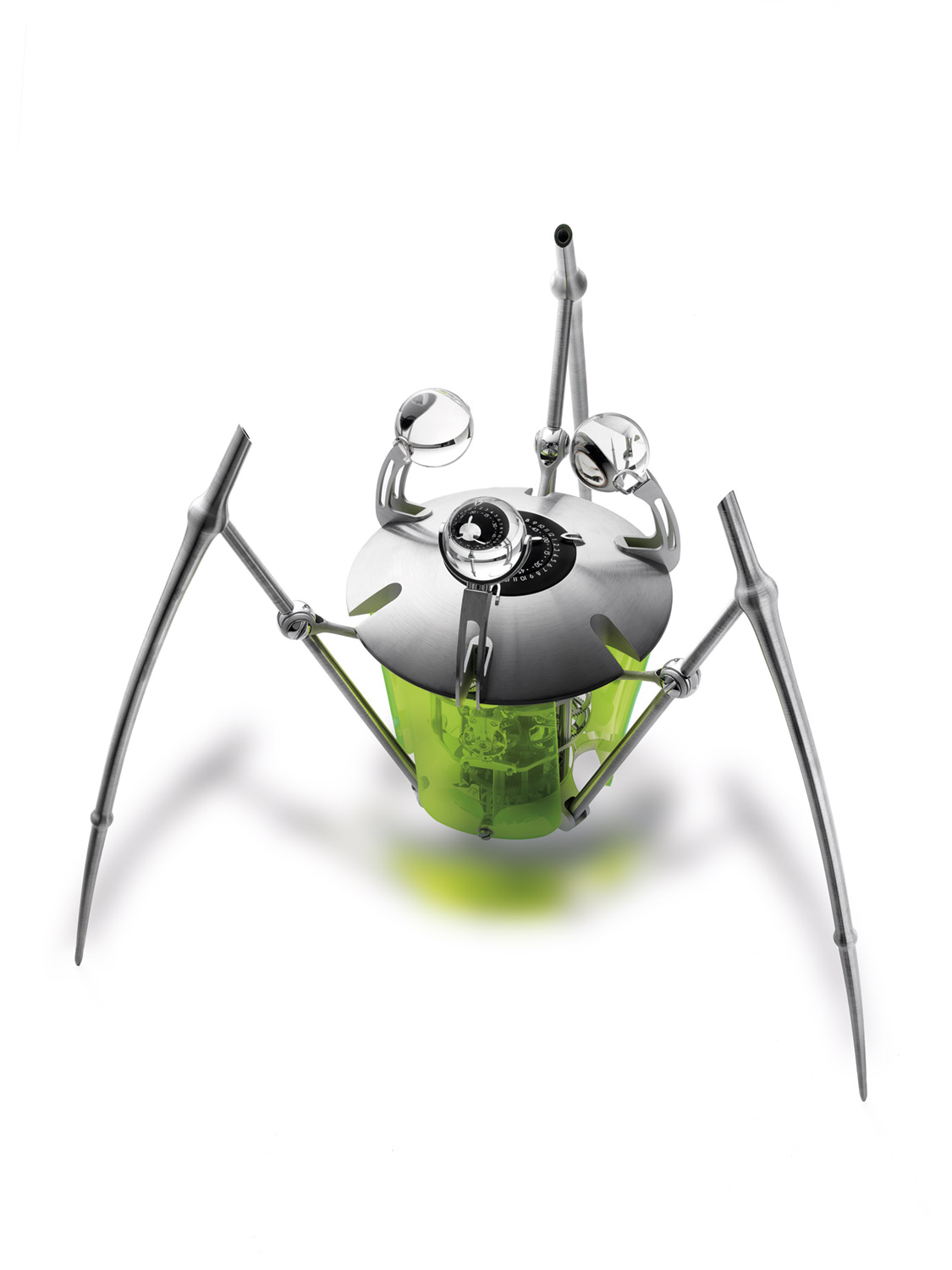 TriPod представляет собой настольные часы с минималистским циферблатом, который подвешен между тремя тонкими опорами, схожими с конечностями насекомого. Вслед за могущественным T-Rex новинка продолжила трилогию Robocreatures – так называются эти уникальные творения MB&F, наполовину роботы, наполовину живые существа. Наименование TriPod обусловлено тройственностью конструкции: три опоры, три сферы, напоминающие глаза насекомого, трехуровневый механизм в основе механического туловища. TriPod стала второй в ряду из трех моделей настольных часов, задуманных как трио. «Подобно тому как Ганс Гигер придумал Чужого, мы создаем свой собственный мир необыкновенных творений», – так охарактеризовал серию Robocreatures основатель MB&F Максимилиан Бюссер.