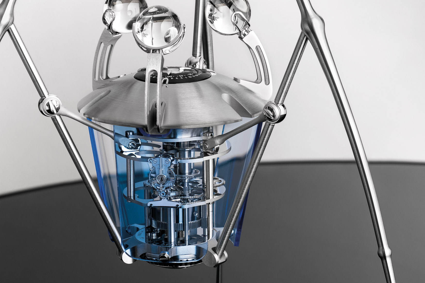 В настольных часах TriPod используется практически та же механика, что и в наручных, только большего размера: трансмиссия, заводной барабан, колесо баланса, анкерное колесо, анкерная вилка. Регулятор хода производства L’Épée 1839 также располагает противоударной системой Incabloc, обычно применяемой только в наручных часах, что сводит к минимуму риск повреждения часов в случае их транспортировки.
