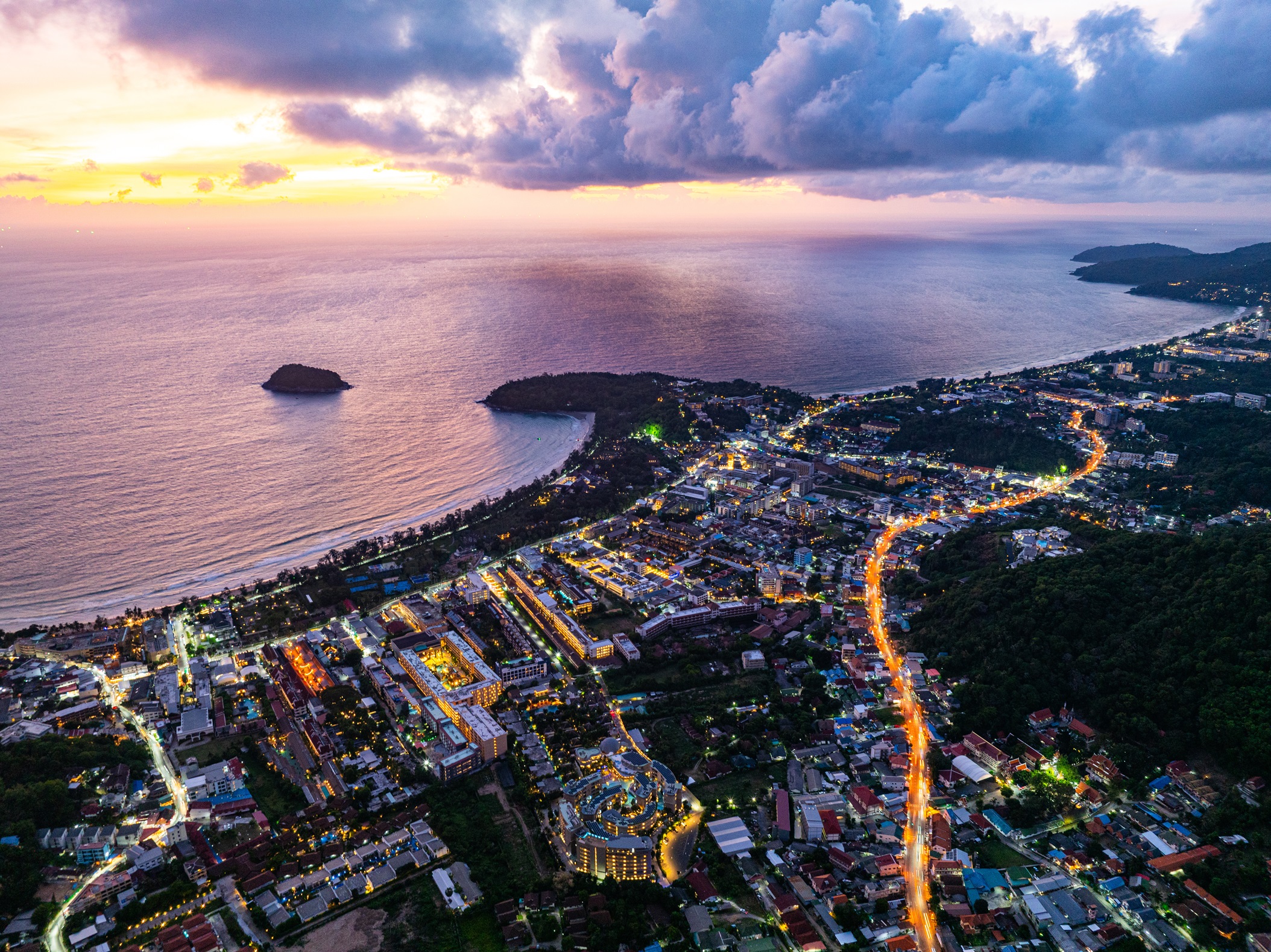 Aerial view Clouds obscure the beautiful sky as the sun sets. The lights along the beach begin to turn on as dusk approaches.There are many buildings, resorts, and hotels that accommodate tourists.