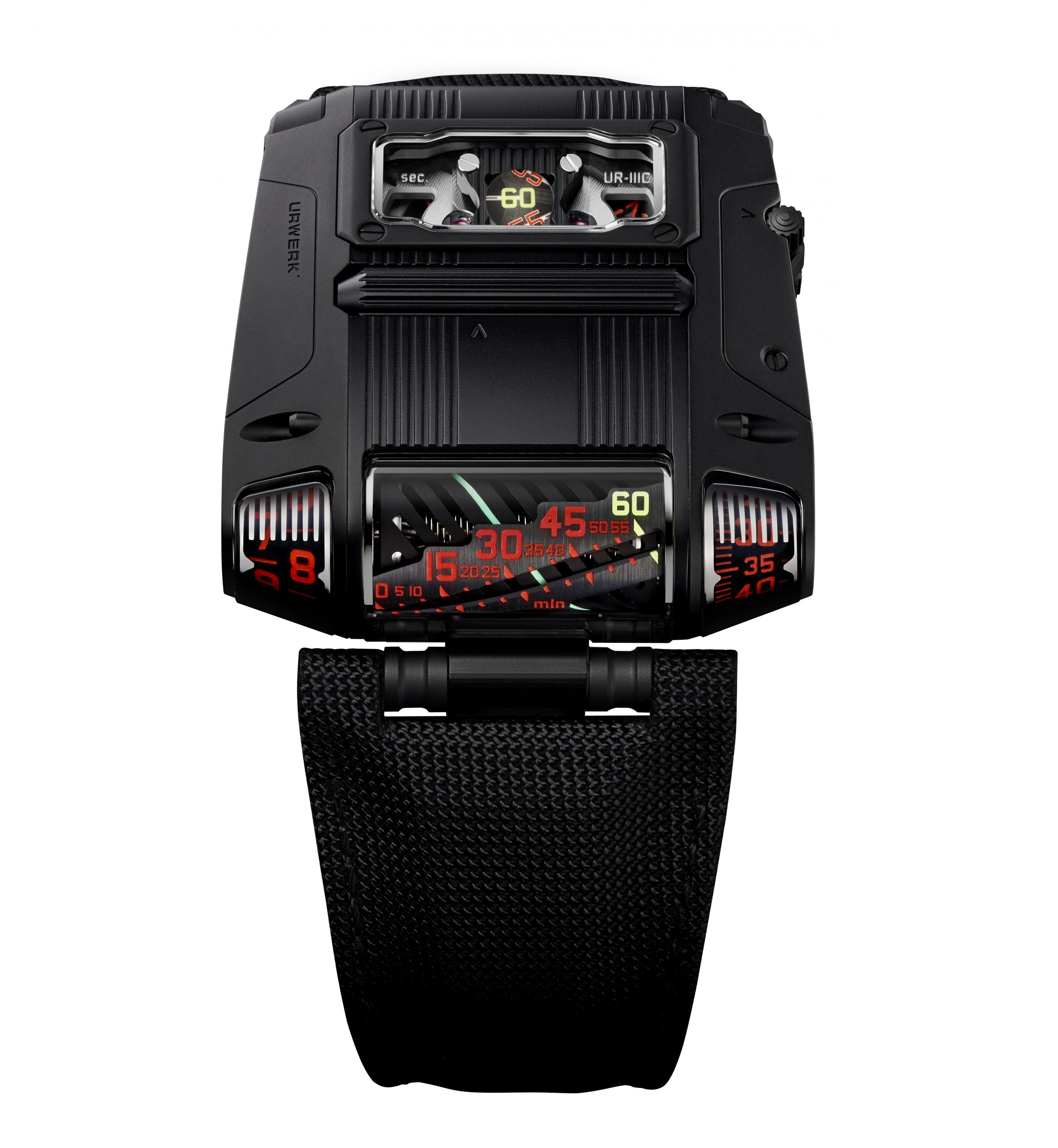 Если дизайн всех моделей URWERK без преувеличения можно назвать исключительным, это объясняется в том числе и их размерами. Чтобы могли проявиться чисто технические характеристики часового механизма, необходимы пространство и объем. Чтобы системы считывания данных были зримы и понятны, необходим масштаб. И чтобы творения, представшие перед внутренним взором дизайнера Мартина Фрая, обрели плоть, необходима жажда успеха. Объем и амбиции UR-111C Black продиктованы теми же самыми соображениями, но их соотношение иное.
