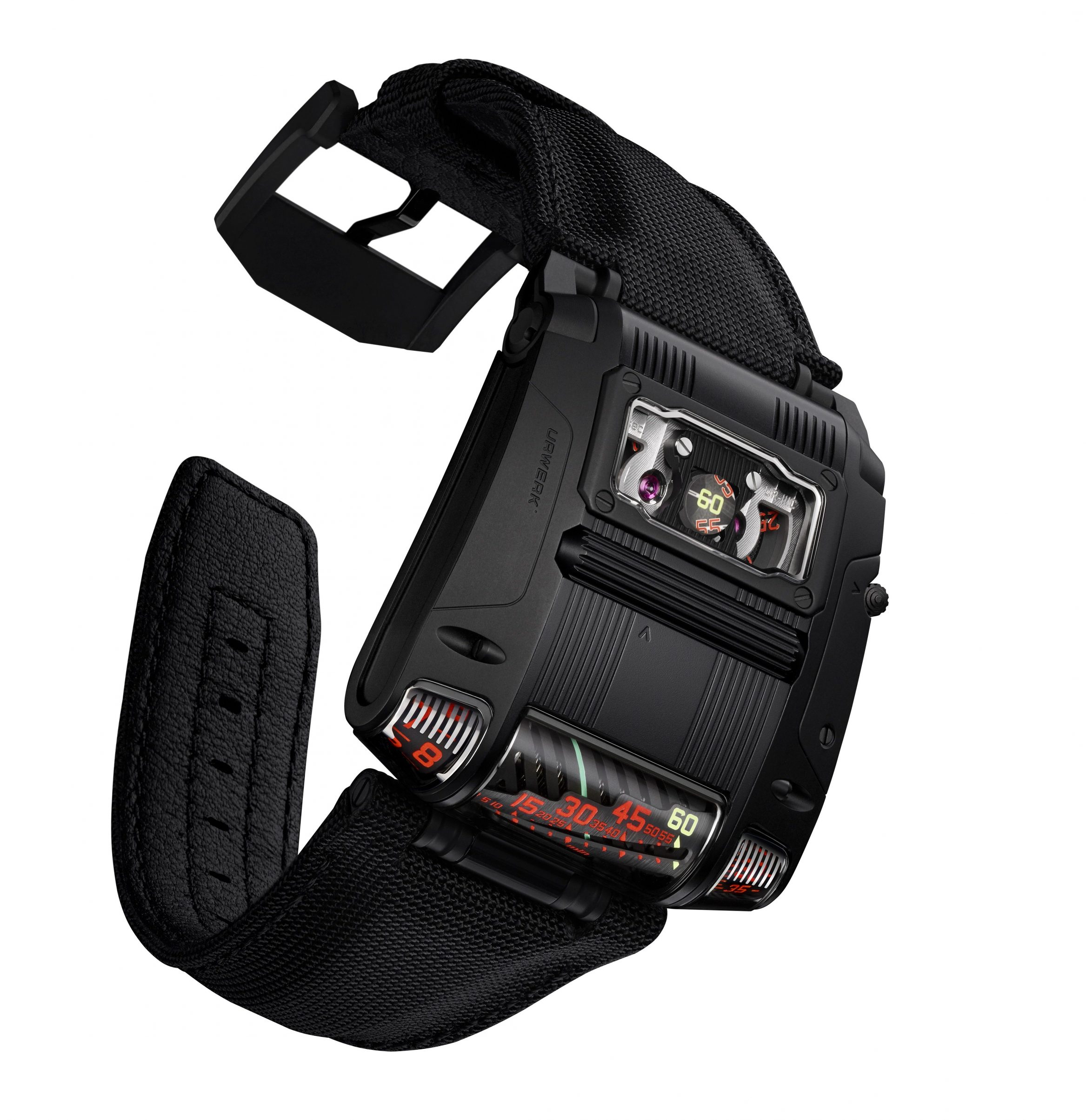 Первая мысль, которая приходит в голову при виде UR-111C Black, – их непохожесть на что-либо известное. Выполненный из стали и титана с черным PVD-покрытием корпус – продолговатый, широкий, выпуклый и рифленый. Боковые поверхности – впалые, так что видны проходящие насквозь винты, удлиненные с помощью выемок. Чему служит этот большой валик посередине? Зачем нужен рычажок на боку корпуса? Модель UR-111C Black приглашает погрузиться в размышления и мечты.