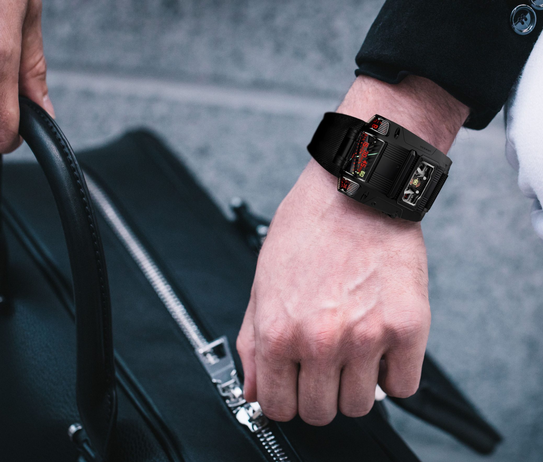 Вызвать к жизни модель, настолько явно отличающуюся от всего известного до сих пор, представляет собой в том числе и технический вызов. Он опирается на культуру часового дела Феликса Баумгартнера – часового мастера и сооснователя URWERK. Своеобразное понимание механизма UR-111C Black привело к созданию уникального корпуса: указатели времени рассредоточены в его разных частях, и каждый раз способ индикации разрушает традиции, что, кстати, является основополагающим в подходе URWERK. Чтобы вместить этот часовой механизм, который одновременно вытянут в длину, ширину и отличается относительным объемом, пришлось отказаться от привычных методов. Вставка механизма в корпус производится ни сверху, ни снизу, а сбоку. Черный корпус состоит из трех частей: две первые – самые маленькие – закрепляют торец механизма, в оставшуюся – центральную и гораздо более крупную – проскальзывает сам механизм.