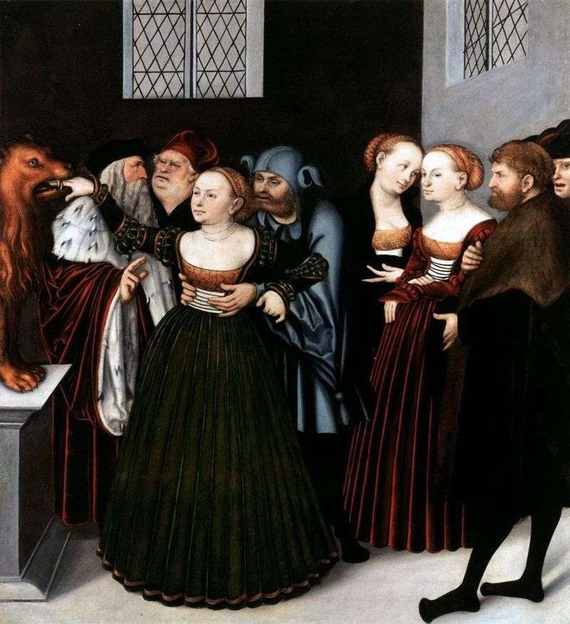 А на картине Кранаха изображена античная круглая мраморная плита с изображением Тритона (бога морей и океанов), которая находится в Риме. Кто смотрел фильм «Римские каникулы», тот знает, о чём речь. Не говоря уже о тех, кто лично в Риме побывал и самолично предание проверял. А предание в средние века существовало такое, что если человек вставит руку в отверстие выполненное в виде рта божества и соврёт на заданный ему вопрос, то «Уста истины» тут же откусят ему руку. Так многие супружеские пары проверяли друг друга на верность. Легенда рассказывает, что однажды некий мужчина усомнился в верности своей жены и попросил её пройти и ответить на его вопрос, держа руку во рту статуи. Жена согласилась, но зная, что толпа соберётся посмотреть на это, попросила местного шута приобнять её на потеху публике, в тот момент когда она будет отвечать на вопрос. На проверке шут её обнял, а она ответила, что в этой жизни к ней прикасались лишь два мужчины: её муж и вот этот шут. Она и не соврала, вот только этот шут и был её любовником. Этот момент и изобразил на своей картине Кранах.