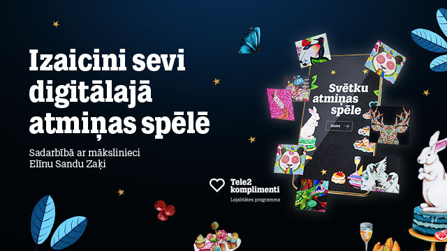 “Tele2” в сотрудничестве с молодой латвийской художницей Элиной Сандой Заке разработал уникальную праздничную игру на тренировку памяти, в которую можно играть с семьей или друзьями и которая доступна всем бесплатно. Вот уже четвертый год подряд “Tele2” в сотрудничестве с одним из латвийских художников разрабатывает к Рождеству игры со специальным дизайном с целью сплочения семьи и друзей, а также популяризации латвийских художников. В течение четырех лет Tele2 инвестировал в создание этих игр более 200 000 евро.