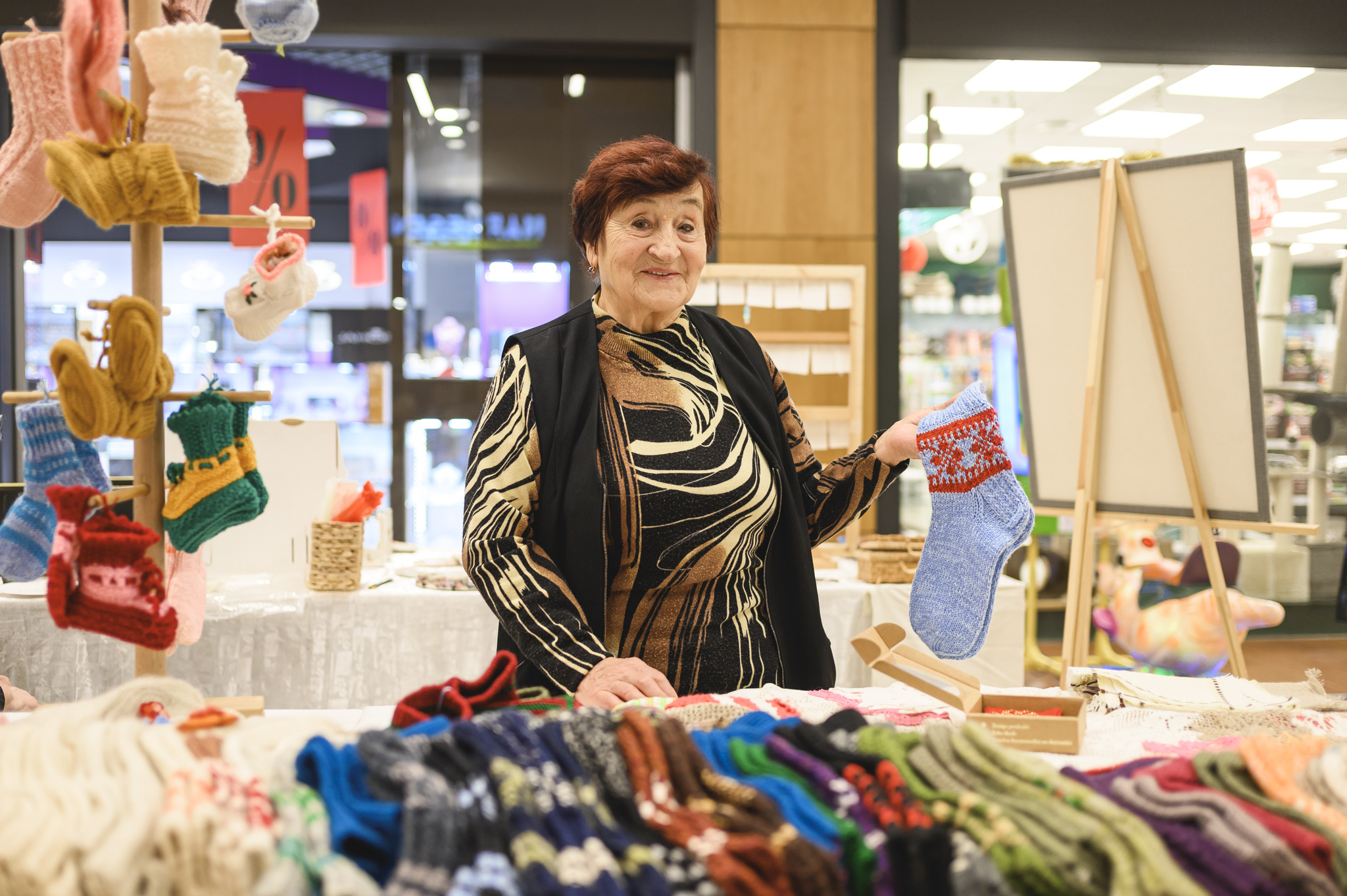 На благотворительной ярмарке представлен широкий выбор вязанных и плетёных изделий. Их предлагают Лига Озолиня (83 года, Екабпилс), Виктория Ильюченока (64 года, Рига), Эрна Саленеце (79 лет, Рига), Лидия Паэгле и Анда Вевере (77 лет, Рига). Кожаные изделия, такие как сумки, фотоальбомы, гостевые книги, кошельки и ремни, предлагают Янис Китис (65 лет, Рига) и Инара Лапса (74 года, Рига).
