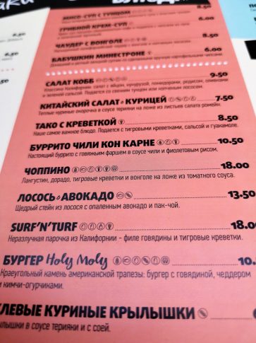 Для любителей классики тоже выбор отменный: буррито (Мексика, все-таки, ближайший «сосед» Калифорнии), морепродукты и, конечно же, Surf’n’Turf — традиционный для Калифорнии тандем стейка с тигровыми креветками, куриные крылышки, утиная ножка. И, конечно же, традиционные панкейки.