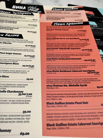 Винная карта ресторана в немалой пропорции состоит из вин Калифорнии и Вашингтона и создана командой сомелье, работающих в холдинге, и самим ресторатором. Более того, это не просто винная карта, но винная карта с аннотациями к каждому вину. Причем аннотации — смесь профессионального языка и понятных советов для неопытных любителей вина. Есть и особое меню, в котором представлено исключительно крафтовое пиво. Причем в пивоварне уже заложено пиво, которое делается в эксклюзивном порядке для данного места.