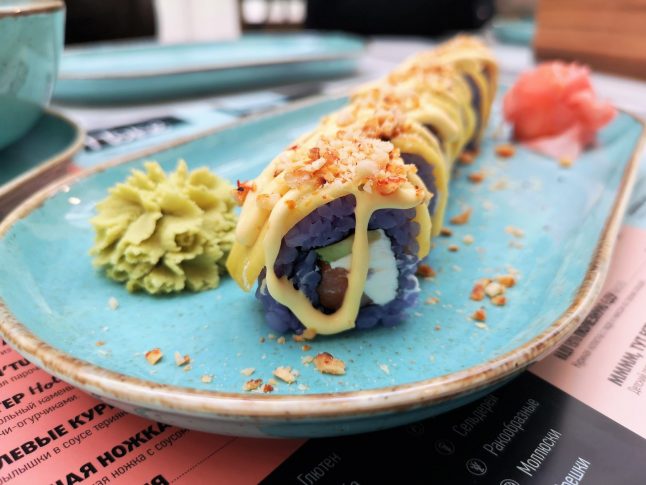 В меню очень много авторских блюд, которые могут вызвать некоторое недоумение у одних, и полный восторг у других. Голубой рис для ролов? Или поке? А почему бы и нет. И если вам это кажется абсурдным, то помните, что вы – далеко не центр мироздания. У нас на дегустации были примерно такие же разногласия. Мы лично такие ролы не поняли, но остальные оценили их весьма высоко. Впрочем, в меню есть и блюда, которые однозначно понравились всем: ролы с тунцом и трюфелем (что не удивительно, ведь в Yakuza, пожалуй, лучшие суши и ролы в городе), картофельные (!) вафли с мясом краба, «белая» пицца (без томатов), нежнейший паштет и все супы! Да и кому может не понравиться грибной крем-суп со… свежесмолотыми кофе! Кстати, так как идея попробовать суп, посыпанный кофе, пришла после того, как был заказан десерт и подан нормальный кофе, то и суп пришлось «запивать» кофе. Сочетание нестандартное, но настолько эффектное и запоминающиеся, что рекомендуем повторить.
