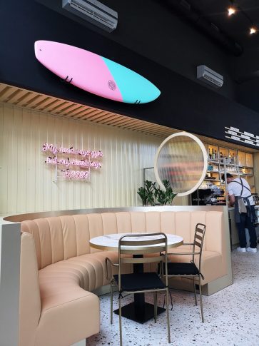 Дизайном интерьера занималась Рина Гогнидзе (бюро RG Interiors), автор всех ресторанов Yakuza и многих других общественных и частных интерьеров. В своей работе дизайнер создала весьма демократичную по американским меркам атмосферу уюта и эстетичности, взяв за основу образы прибрежных кафе в Санте-Монике. В интерьере много зелени, настоящая доска для серфинга, а также необычный металлический сайдинг, который напоминает о знаменитых спасательных станциях на пляжах в районе Лос-Анджелеса. На одной из стен ресторана — граффити в исполнении латвийских художников Татьяны Стеценко и Артема Косенко.