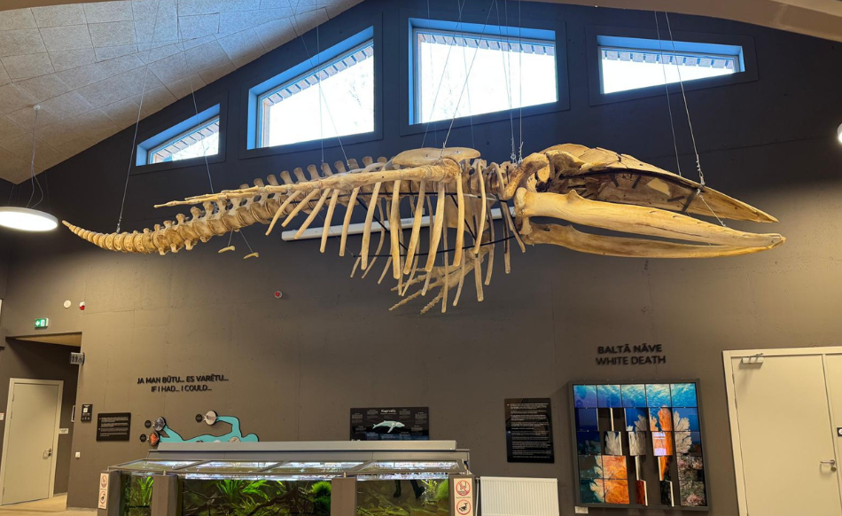 В Рижском национальном зоологическом саду открыта новая, визуально впечатляющая экспозиция – скелет горбатого кита, размещённый под потолком Центра экологического образования «Zinarium». Скелет длиной более десяти метров установлен таким образом, будто морской гигант находится в движении, что позволяет посетителям взглянуть на него с необычного ракурса и одновременно познакомиться с анатомией кита и значением морских экосистем.