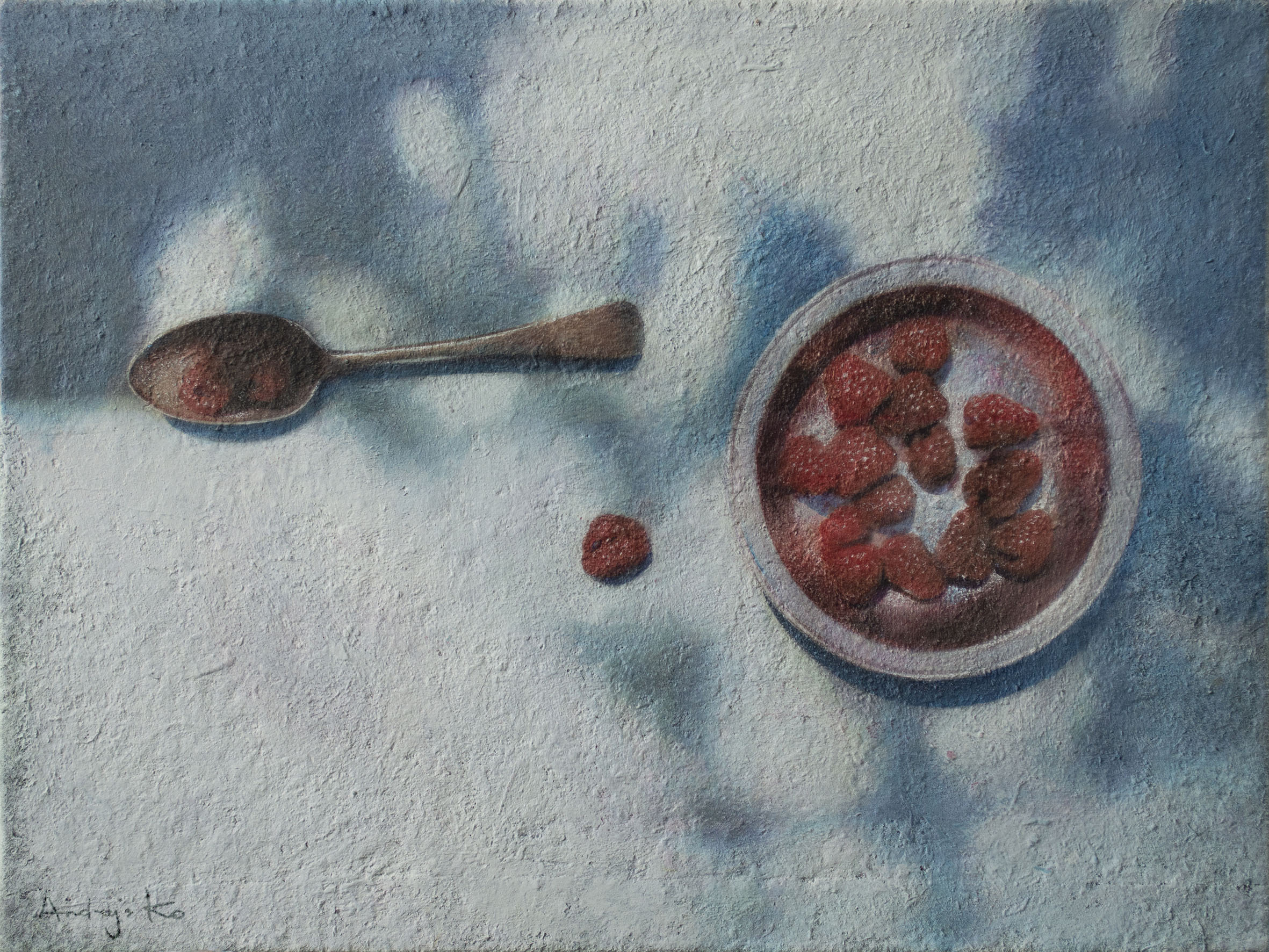 Выставка «Завтрак дрозда в солнечном саду» знакомит лишь с небольшой частью картин из серии 160 натюрмортов, созданных художником за последние два года. Новый цикл своих произведений Андрей Ко посвятил тёплым летним солнечным вечерам и свету утреннего солнца, скользящего вдоль неровных изгибов стен и предметов, прячущегося в листве деревьев и исчезающего в нежных полутонах где-то на границе с тенью. Старый чайник, серебряная ложечка, ягоды и фрукты словно забыты кем-то в саду или специально оставлены на радость голодным птицам.