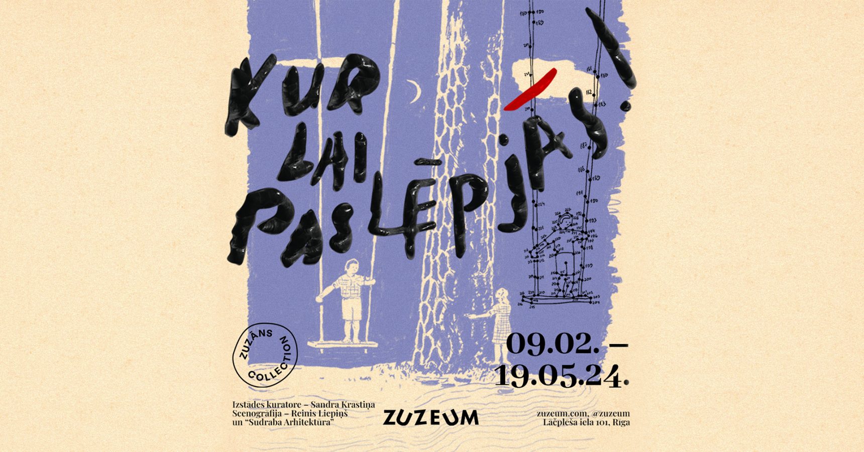 С 9 февраля до 19 мая 2024 года в Большом выставочном зале арт-центра Zuzeum будет проходить выставка «Куда бы спрятаться!» Куратор – Сандра Крастиня, сценография – Рейнис Лиепиньш и Silver Architecture. На выставке представлено более 350 произведений искусства из коллекции Зузансов, Латвийского Национального художественного музея, частных коллекций, а также материалы из Латвийского Государственного архива кинодокументов.