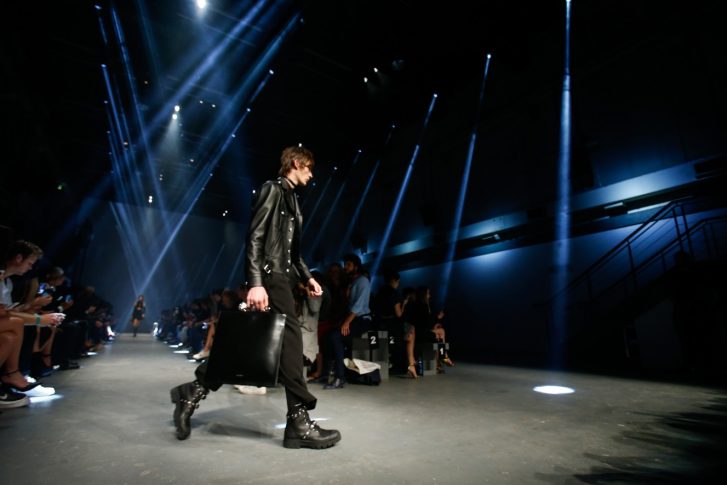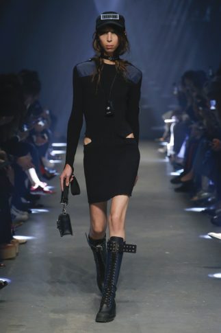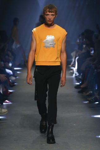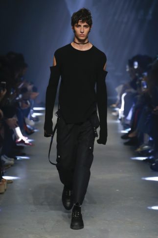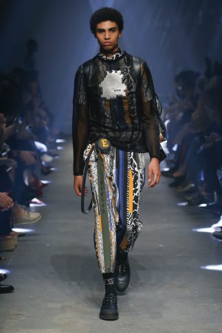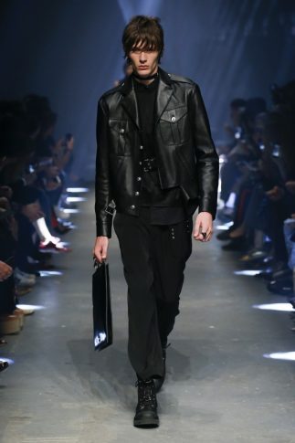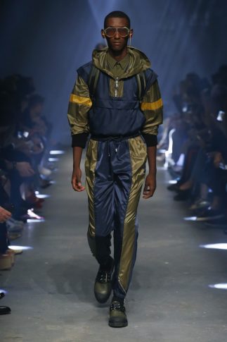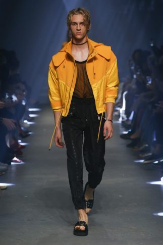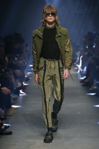Мужская линия отражает и развивает тему женской коллекции, особенно в кожаных куртках, бомберах и утилитарных силуэтах. Здесь также широко присутствует металлическая сетка. Часы, например, модель Fire Island с ремешком, украшенным трехмерным изображением головы льва и шипами, или урбанистическая модель Tokyo Rubber, несут в себе неповторимый заряд энергии. Металлическая сетка применяется в новой технике: в качестве подкладки для двухслойного платья-чехла, где она дополняет нейлоновый слой.