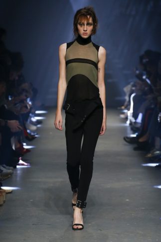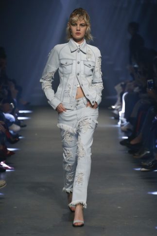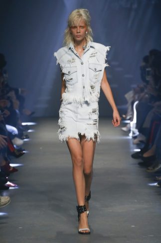 Трикотаж играет особую роль: в жаккарде с новым принтом Versus, в элегантных и стильных свитерах или со слоем из металлической сетки, использованной в окантовке. Вечерние платья со вставками из денима и небрежным мужским кроем, с подкладкой из металлической сетки или подкладкой со стразами, проглядывающей через разрезы и разрывы ткани. Туфли с минималистичными каблуками на лодыжке крепятся широким кожаным ремешком, точно таким же, какой появляется на кожаной сумке геометрической формы.