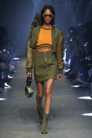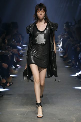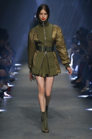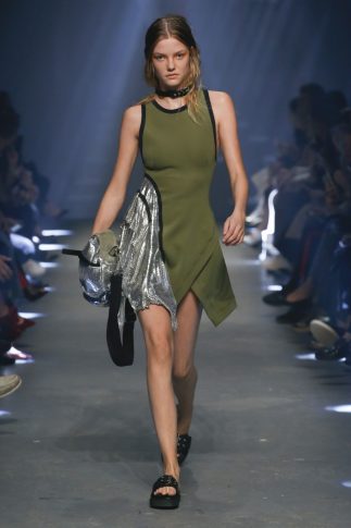 Укороченные куртки-бомберы на молнии с гипертрофированными воротниками или модели oversize с поясом. Пальто из парашютного нейлона со вставками из неопрена отличаются легкостью и плавностью линий в сочетании с утилитарной прочностью, особенно в вариантах с широким поясом на груди. Культовая металлическая сетка обретает новое прочтение в спортивных платьях из скубы, которая потом словно крошится и распадается на мелкие частицы, создавая особенный эффект.