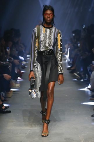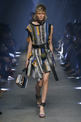 Металлическая сетка применяется в новой технике. Например, в качестве подкладки для двухслойного платья-чехла, где она дополняет нейлоновый слой. Совершенно новый принт Versus Versace строится вокруг коллажа с элементами анималистических принтов и вертикальными полосками, которые перекликаются в случайном порядке со вспышками ярких цветов.