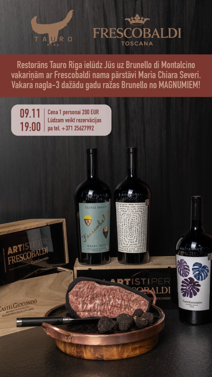 9 ноября на винном арт—ужине в TAURO будут представлены 7 вин Frescobaldi, включая 3 винтажных вина из серии Arti per Frescobaldi, произведенных в 2011, 2013 и 2015 годах. Вина дополнит дегустационный сет, составленный из 5 блюд итальянской кухни и фирменной говядины TAURO, которая будет подана на горячей мраморной доске.