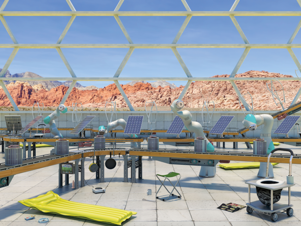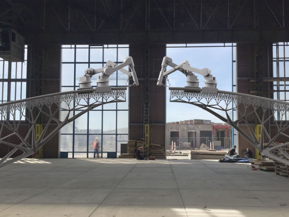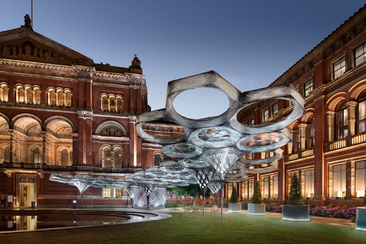 Экспозицию выставки дополняет биомеханический навес Elytra Filament Pavilion. Впечатляющая конструкция иллюстрирует то, как роботехнологии внедряются в архитектуру. Отдельные модули навеса были разработаны по компьютерному алгоритму, а затем изготовлены с помощью промышленного робота. Elytra Filament Pavilion возведен командой из Штутгартского университета при участии Ахима Менгеса и был впервые представлен в прошлом году в Музее Виктории и Альберта в Лондоне.