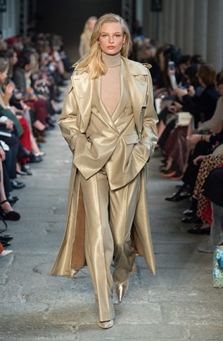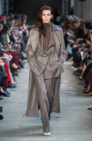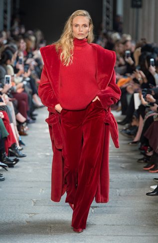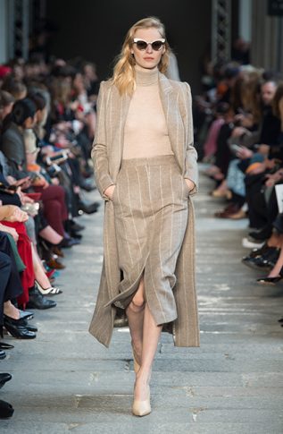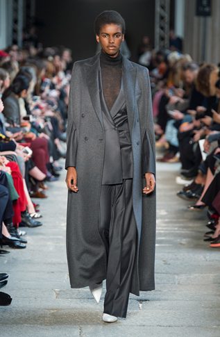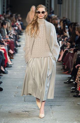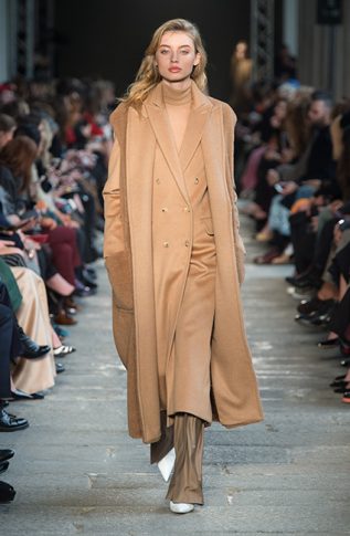 Креативный директор Дома MaxMara Иэн Гриффит решил вернуться к классическим силуэтам и ключевым кодам ДНК-бренда. Дизайнер ввел в коллекцию FW17 ряд классических пальто цвета camel, а также объемные свитера и водолазки. Показ открыла российская супермодель Наташа Поли в насыщенно-красных брюках, свитере и длинной дубленке, к рукавам которых были пришиты рукавицы. Несмотря на обилие однотонных образов, каждому предмету из новой коллекции Max Mara FW 17-18 присуща фактурность и объем. Иэн Гриффит визуально разделил коллекцию на пять цветовых сегментов, первый из которых — красный, второй — темно-коричневый, затем следует серый, четвертый — оттенок camel, и, наконец, последний более темный — черный. Осенние девушки MaxMara могут не переживать за снежную и холодную непогоду. Для них дизайнер разработал ряд длинных жакетов, меховых шуб, длинных велюровых юбок и шерстяных безрукавок.
