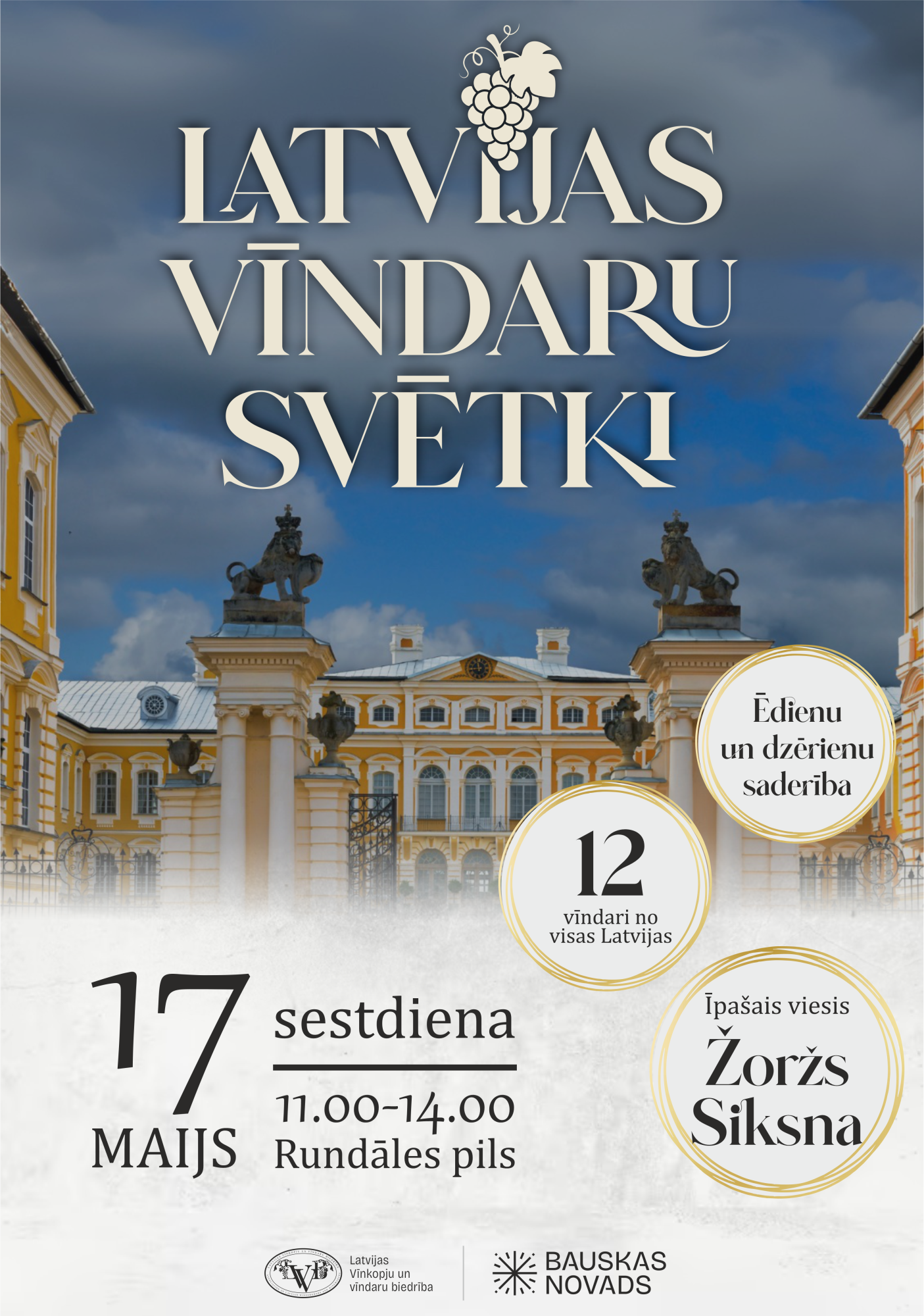 17 мая во внутреннем дворе Рундальского дворца впервые пройдет Праздник латвийских виноделов. С 11:00 до 14:00 гости смогут встретиться с 12 ведущими виноделами Латвии из разных регионов, продегустировать их продукцию, попробовать местные угощения и принять участие в тематических мастер-классах.