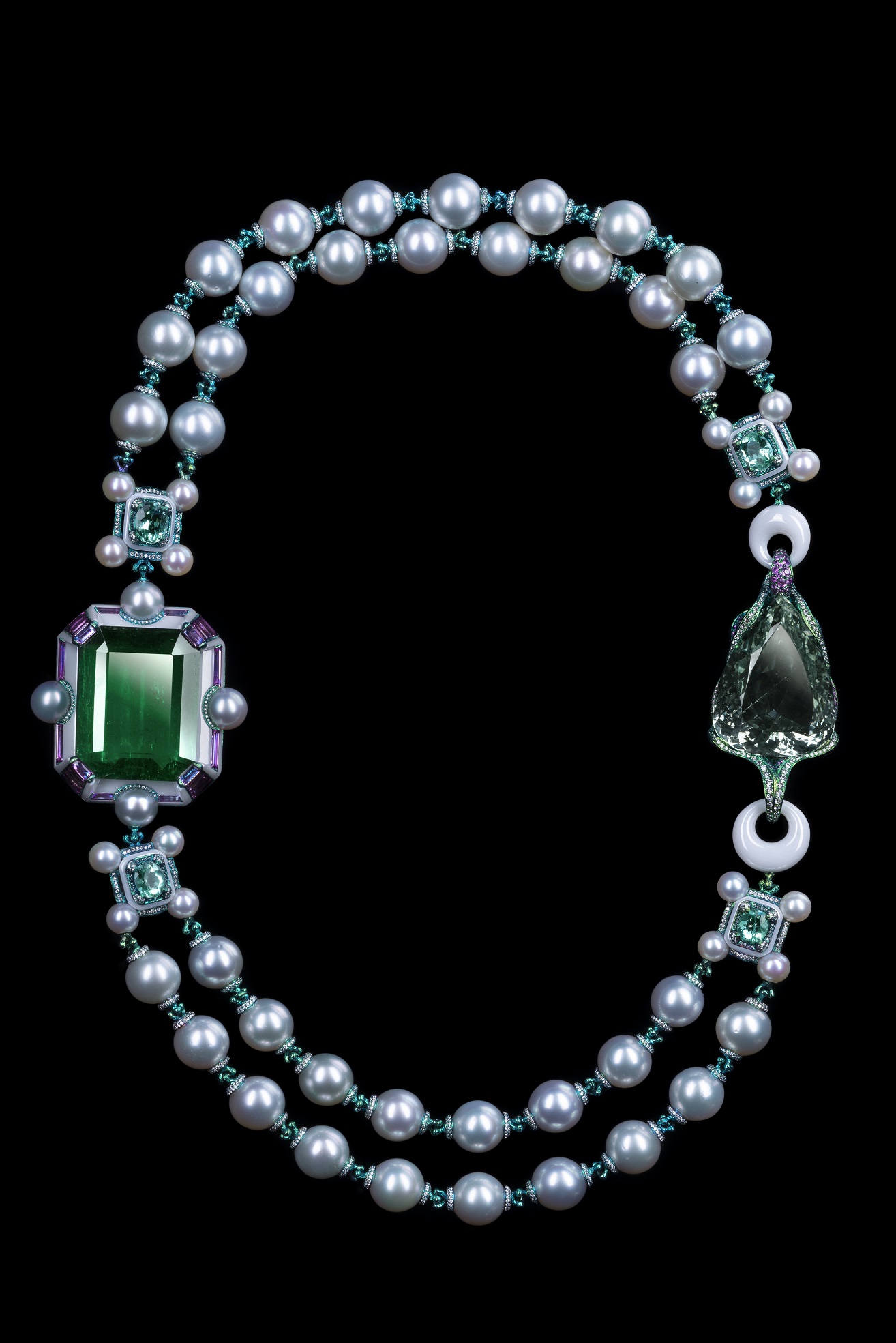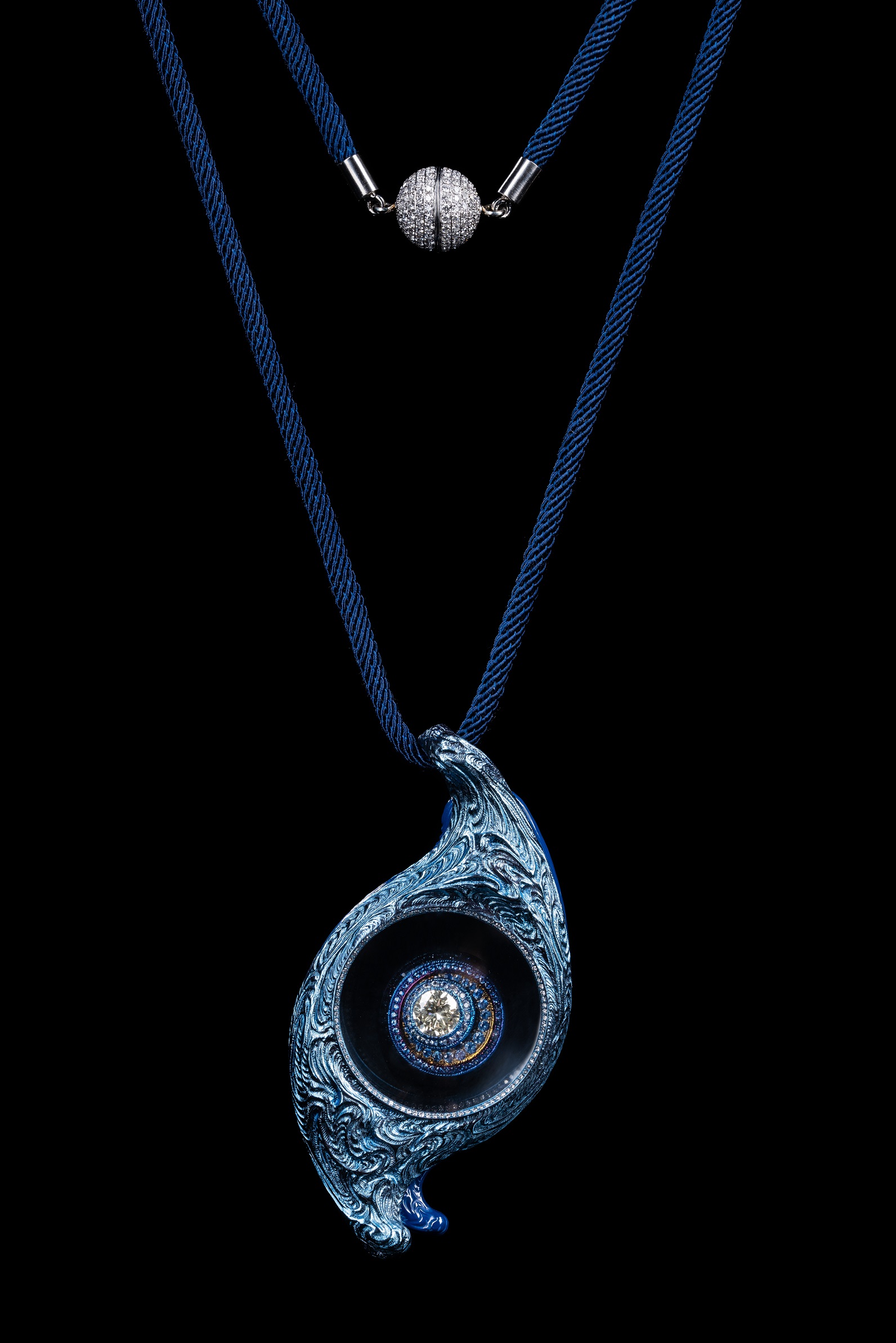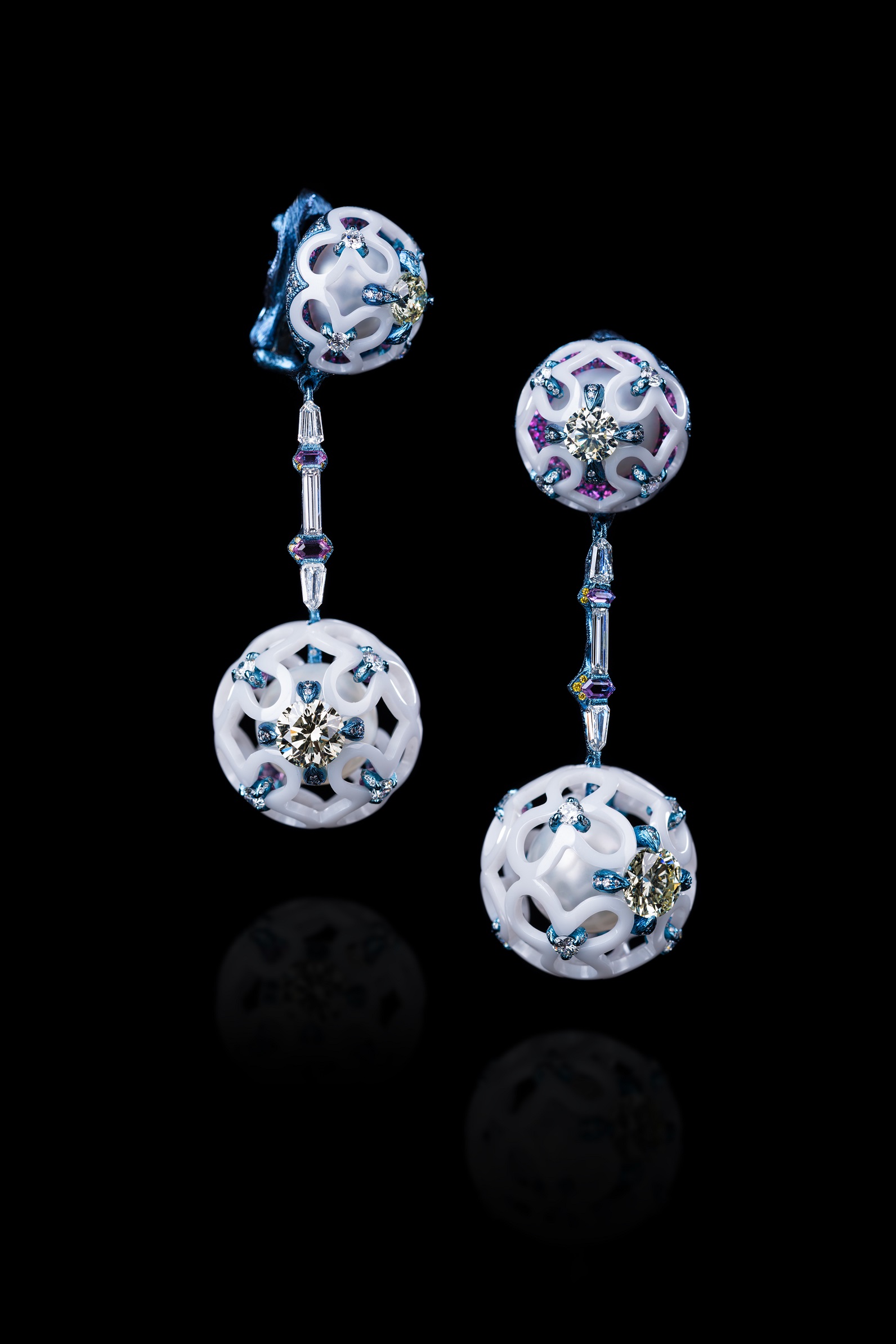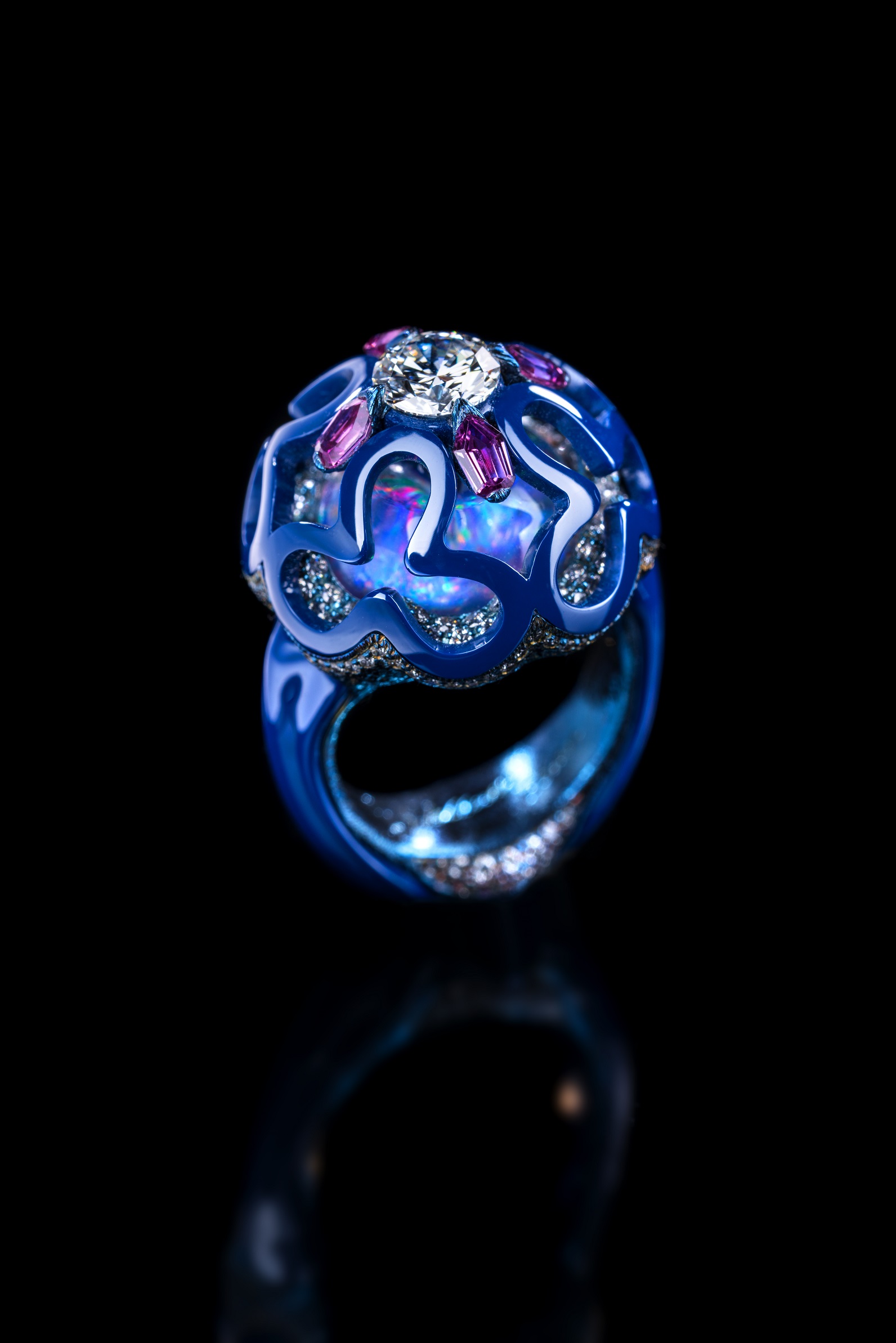 14 ювелирных изделий из “нового” фарфора, инкрустированных разноцветной россыпью драгоценных камней, в конце прошлого года были продемонстрированы на частном показе Shapeshifter: The Multiverse of Wallace Chan в Нью-Йорке. Фарфор в данной серии не только имеет свой классический окрас, но и представлен в иных красочных вариациях — нежно-розовом и голубом. В звучном цветовом аккорде с ним сливаются драгоценные камни, бриллиантовое паве и один из излюбленных материалов Уоллеса Чана — титан. К слову, этот металл обладает патентом Titanium Jewelry. Дело в том, что ювелиру удалось разработать технику, которая позволяет раскрашивать титан в различные цвета.