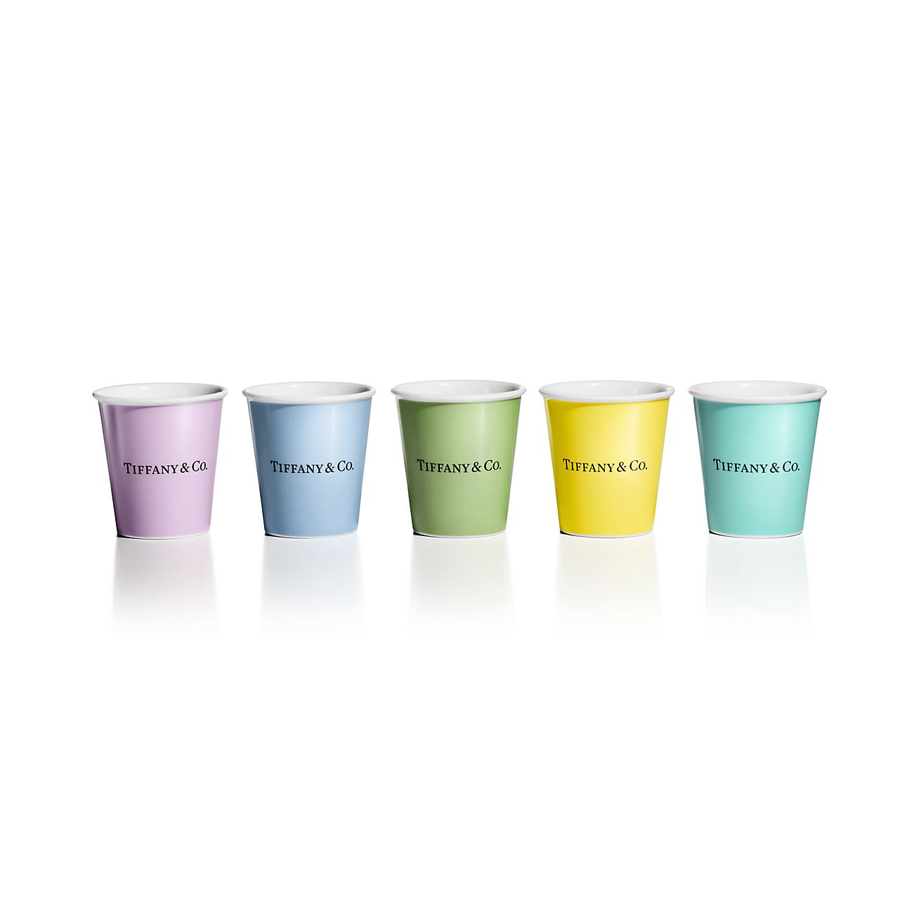 Набор из пяти стаканчиков можно приобрести в фирменном цвете Tiffany, а также в желтом, зеленом, фиолетовом и синем. В описании к товарам отмечается, что посуду можно мыть в посудомоечной машине, но нельзя использовать в микроволновой печи. Дешевле (за $250) обойдется набор стаканчиков для эспрессо — по 100 мл. Дороже будут стоит стаканчики по 283 мл.
