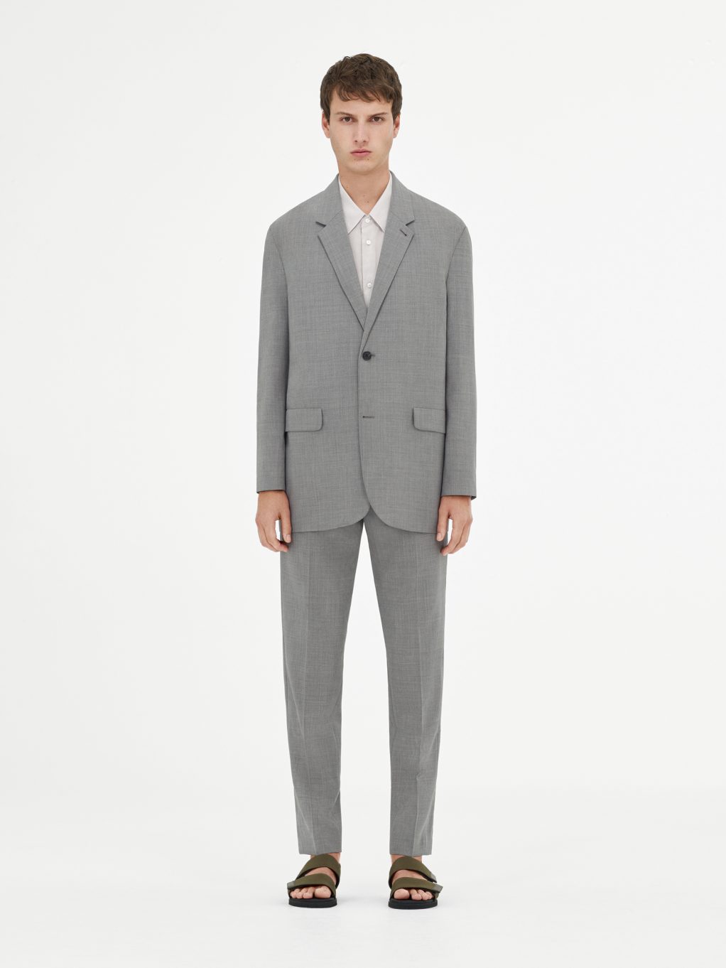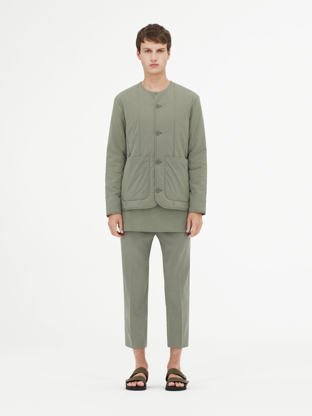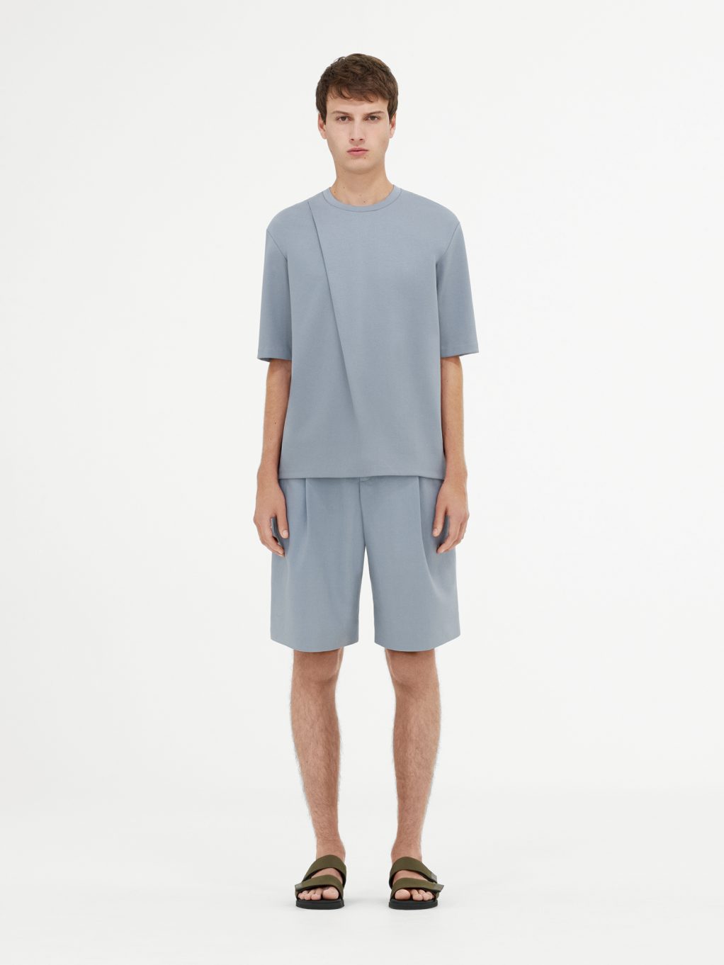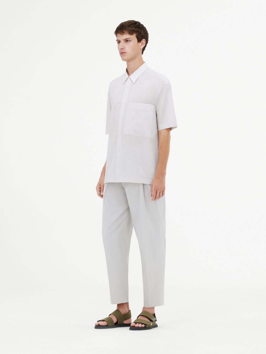 Простота и легкость являются неотъемлемой частью всей мужской коллекции в ее многообразии. Укороченные брюки и фактурная футболка oversize с короткими рукавами создают модный образ в новом прочтении. Легкие шерстяные укороченные брюки комбинируются со стеганым хлопчатобумажным пиджаком и удлиненным топом из хлопкового джерси, все части ансамбля представлены в цвете шалфея – современный взгляд на лаконичный образ, где драпировка и объем подаются отдельными, но заметными частями. Шерстяной пиджак в микро-клетку цвета серый меланж дополняется рубашкой серо-голубого цвета с переосмысленным дизайном воротника.