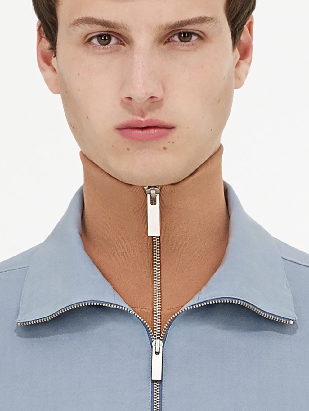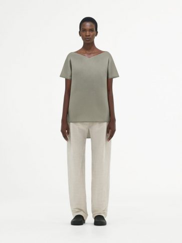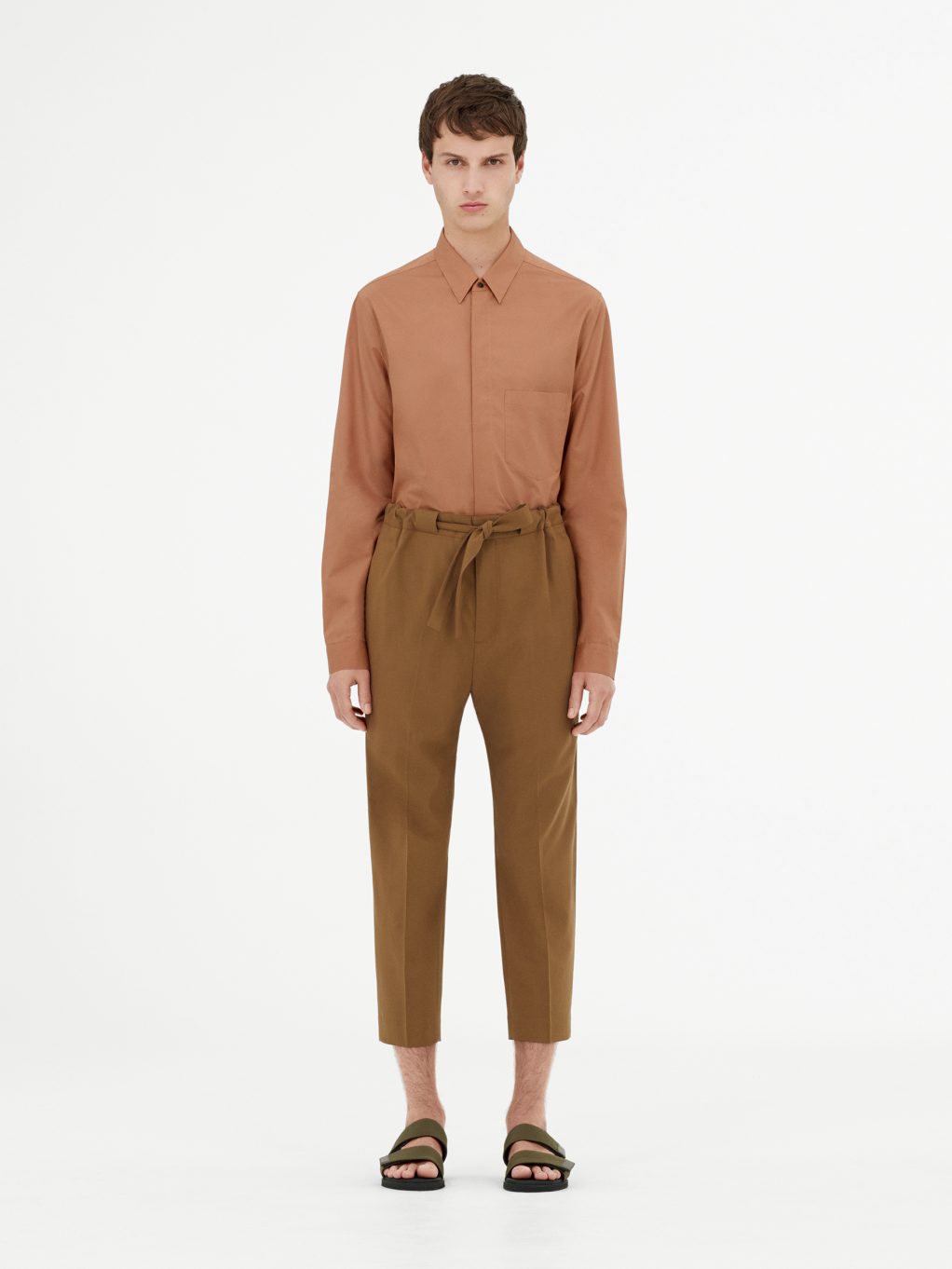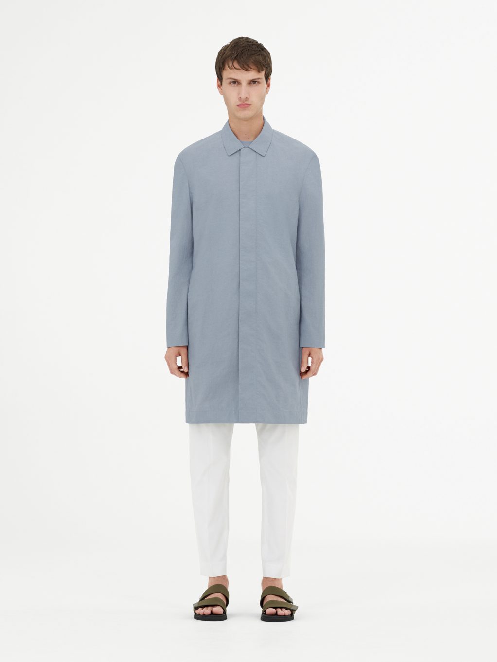 Простота и легкость являются неотъемлемой частью всей мужской коллекции в ее многообразии. Укороченные брюки и фактурная футболка oversize с короткими рукавами создают модный образ в новом прочтении. Легкие шерстяные укороченные брюки комбинируются со стеганым хлопчатобумажным пиджаком и удлиненным топом из хлопкового джерси, все части ансамбля представлены в цвете шалфея – современный взгляд на лаконичный образ, где драпировка и объем подаются отдельными, но заметными частями. Шерстяной пиджак в микро-клетку цвета серый меланж дополняется рубашкой серо-голубого цвета с переосмысленным дизайном воротника.
