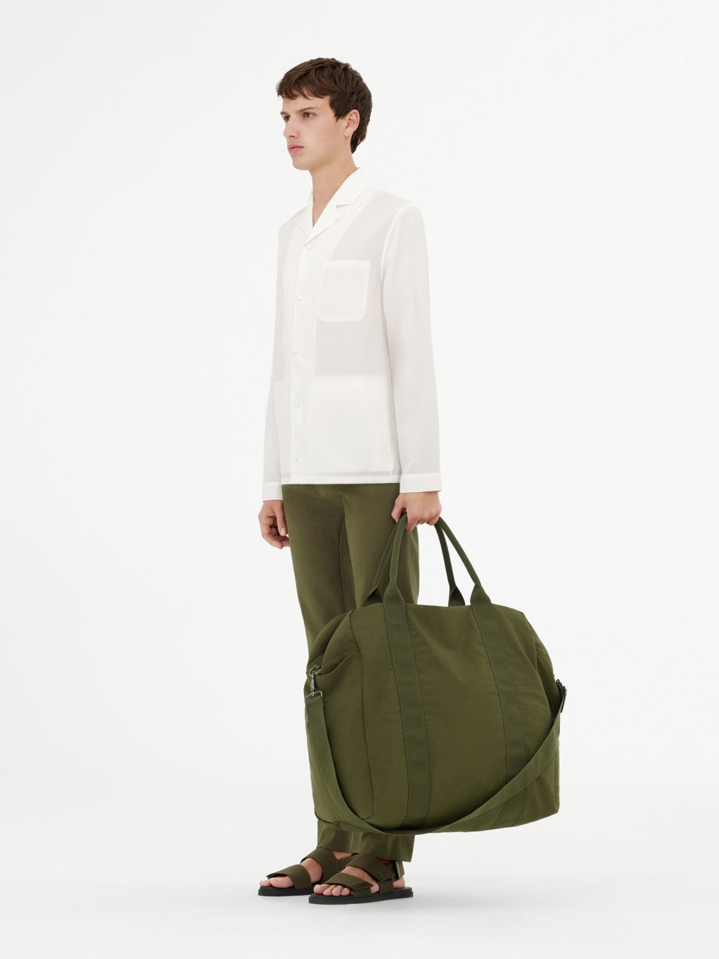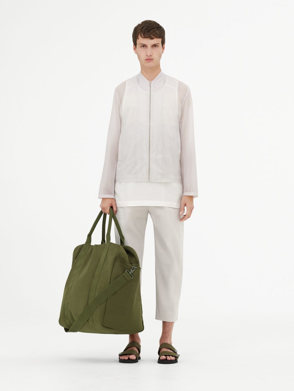 Сандали цвета зленого хаки контрастируют с песочного цвета кедами из нубука. Ключевой аксессуар сезона – прорезиненный кожаный рюкзак с деталями на липучке.