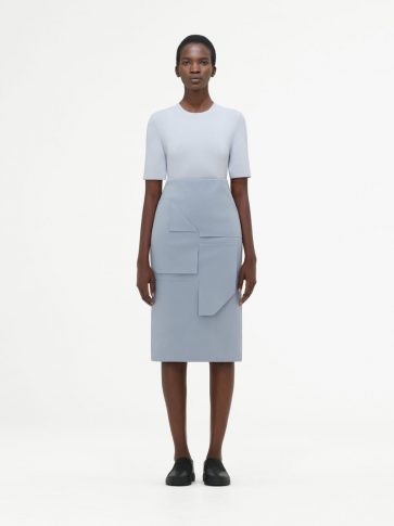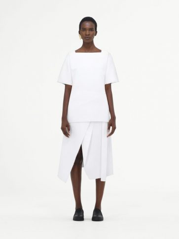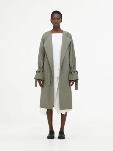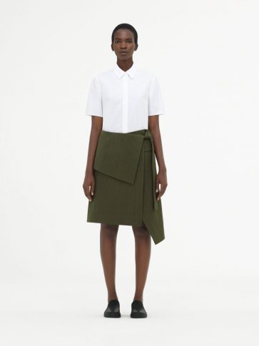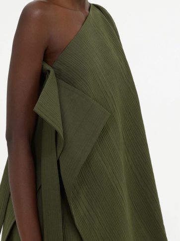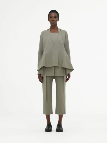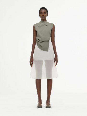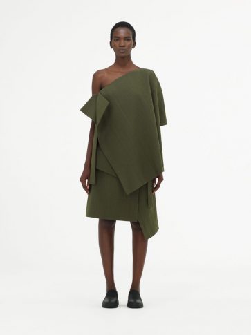 Точность главенствует и оттеняется нежностью, воплощаясь в модном и выразительном подходе к драпировке. Такой подход особо виден в комплекте из текстурированной юбки-передника и ассиметричного топа цвета хаки.