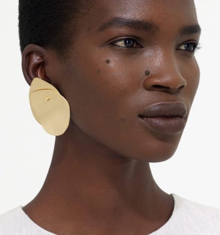 Комплект из позолоченных украшений абстрактной формы включает в себя кольцо, серьги и ожерелье. Коллекцию украшений дополняют кожаная сумка на плечо цвета шалфея, кожаные кеды и сандали с эластичными деталями.