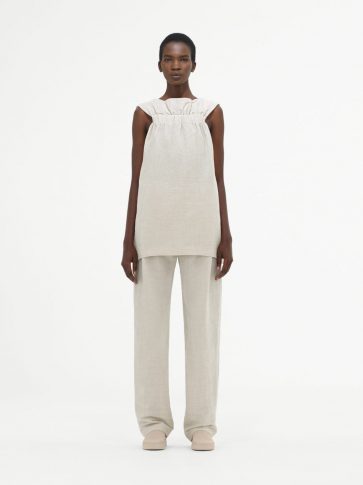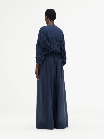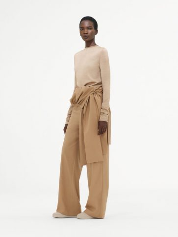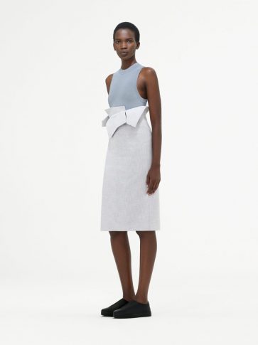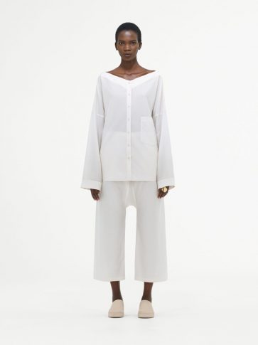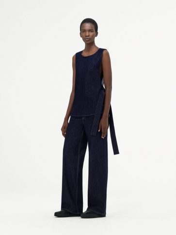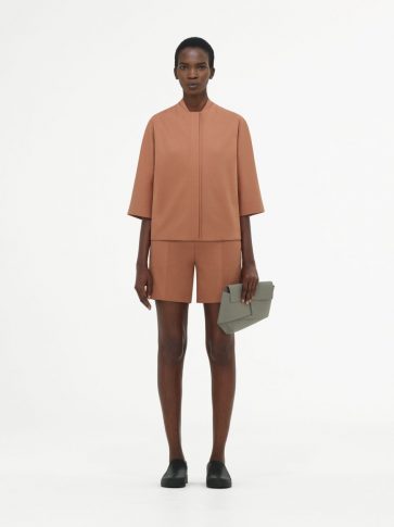 В этом сезоне переосмыслен костюм-двойка. Хлопковый поплиновый топ со съемной передней частью составил пару прямым брюкам, в то время как объемный бомбер из шелкового хлопка с эластичными деталями комбинируется с широкими брюками цвета синей стали. Игривая легкость воплощается в сочетании рыбацких брюк со шнуровкой и объемной рубашки с обновленным дизайном воротника.