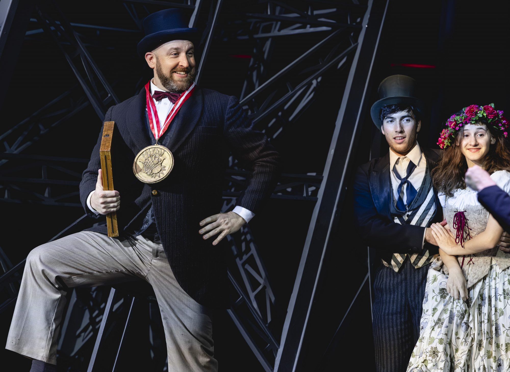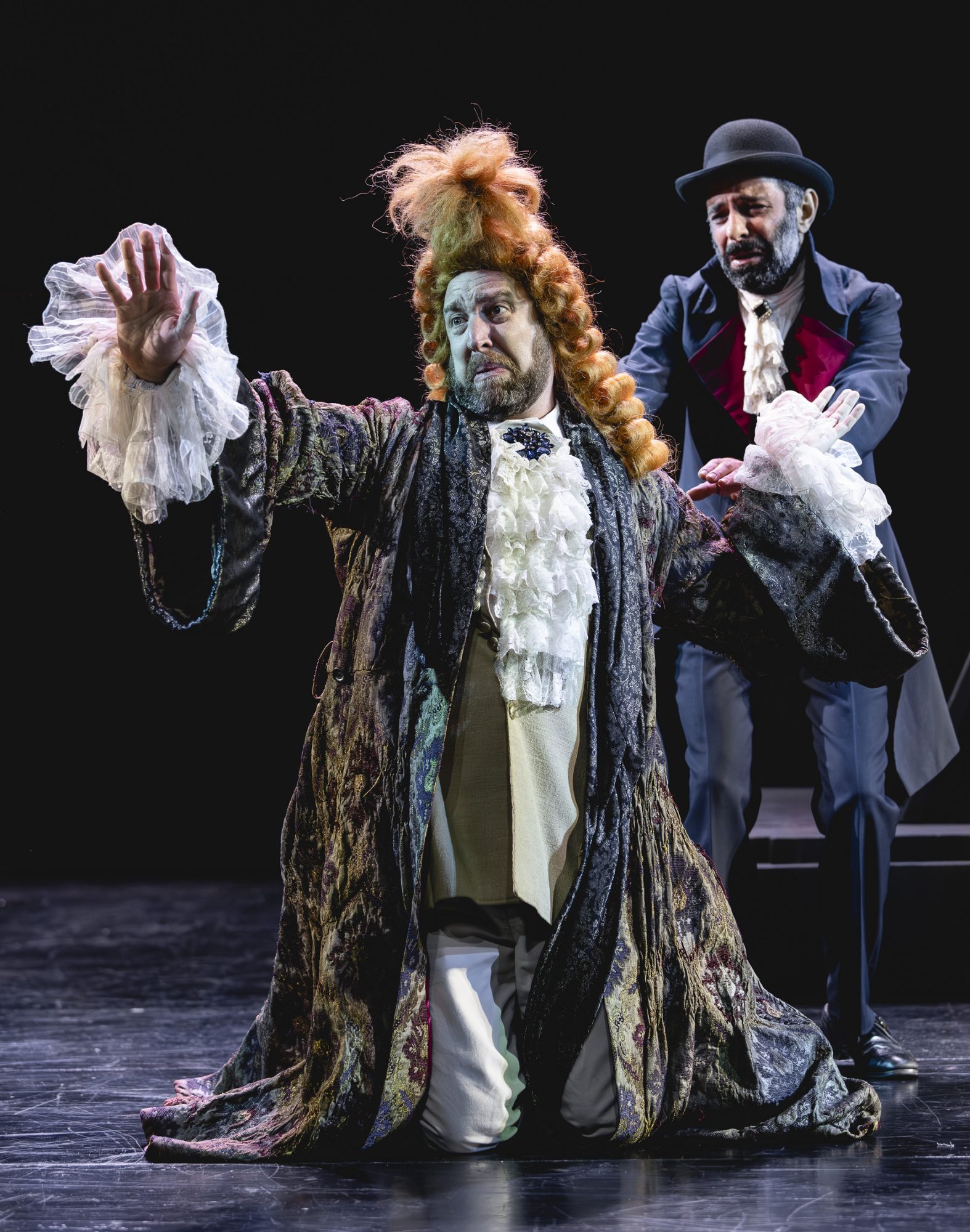 Бравые марши, воспевающие подвиги на полях сражений, он тоже убрал. И хотя от войны никуда не деться ни в пьесе, ни в жизни (Туминас вернулся в Тель-Авив 6 октября, за день до атаки ХАМАС, и отказался покинуть страну, несмотря на уговоры близких и коллег), не острая шпага Сирано занимает режиссера, а острый ум, не отчаянная храбрость, а подлинный талант. Талант писать стихи, талант любить до гроба и жертвовать ради любви собственным счастьем.