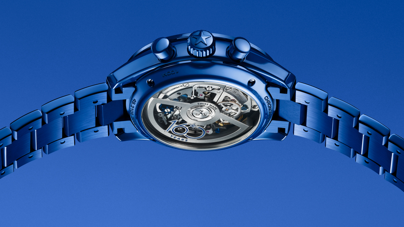 По случаю 160-летия Дома часы PILOT Big Date Flyback предстают в эффектной монохромной версии, корпус, циферблат и ремешок которой выдержаны в синем цвете. Корпус диаметром 42,5 мм, изготовленный из керамики нового ярко-синего оттенка с микроструйной обработкой, имеет титановую заводную головку и прямоугольные кнопки. Стрелки и крупные арабские цифры на рифленом циферблате покрыты люминесцентным материалом, обеспечивающим оптимальную видимость в любых условиях.